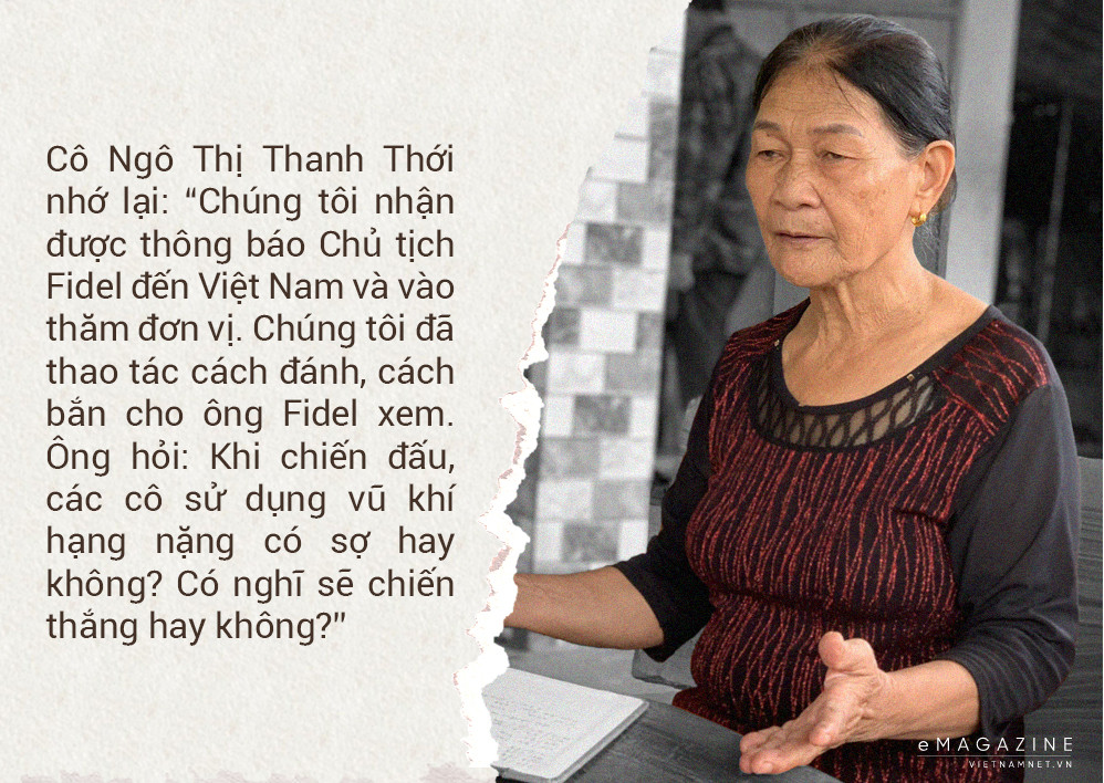 Cô Ngô Thị Thanh Thới nhớ lại: “Chúng tôi nhận được thông báo Chủ tịch Fidel đến Việt Nam và vào thăm đơn vị. Chúng tôi đã thao tác cách đánh, cách bắn cho ông Fidel xem. Ông hỏi: Khi chiến đấu, các cô sử dụng vũ khí hạng nặng có sợ hay không? Có nghĩ sẽ chiến thắng hay không?