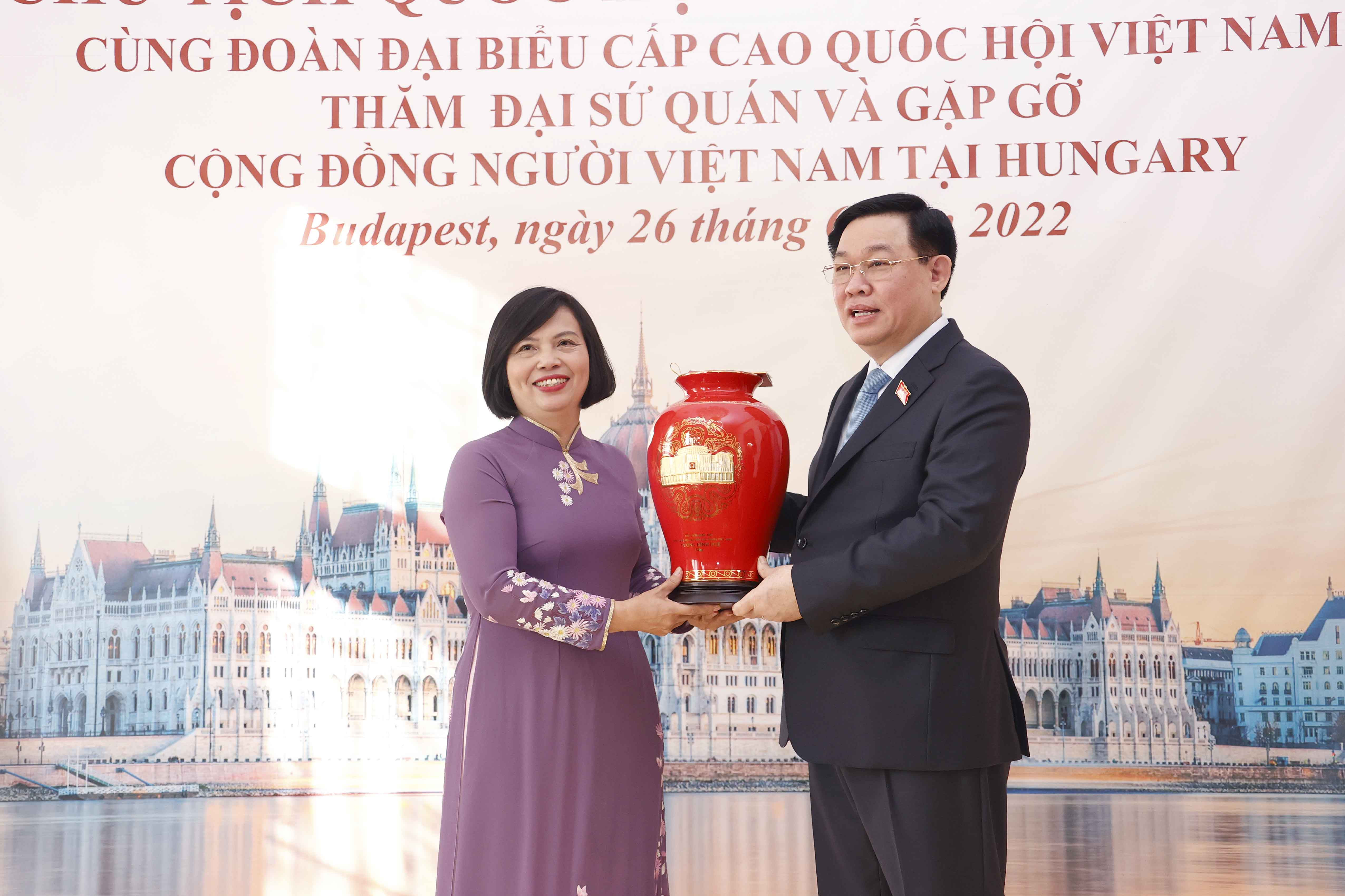 Chủ tịch Quốc hội đề nghị Đại sứ quán tiếp tục làm tốt công tác người Việt Nam tại Hungary; mong muốn cộng đồng người Việt tại Hungary luôn phát huy truyền thống đoàn kết, đùm bọc lẫn nhau, tuân thủ các quy định pháp luật của Hungary, gìn giữ và quảng bá hình ảnh đất nước, con người Việt Nam. Các hội đoàn người Việt tiếp tục phát huy vai trò hạt nhân trong việc xây dựng cộng đồng ngày càng ổn định và phát triển, trở thành cầu nối vững chắc cho quan hệ Đối tác toàn diện Việt Nam-Hungary.