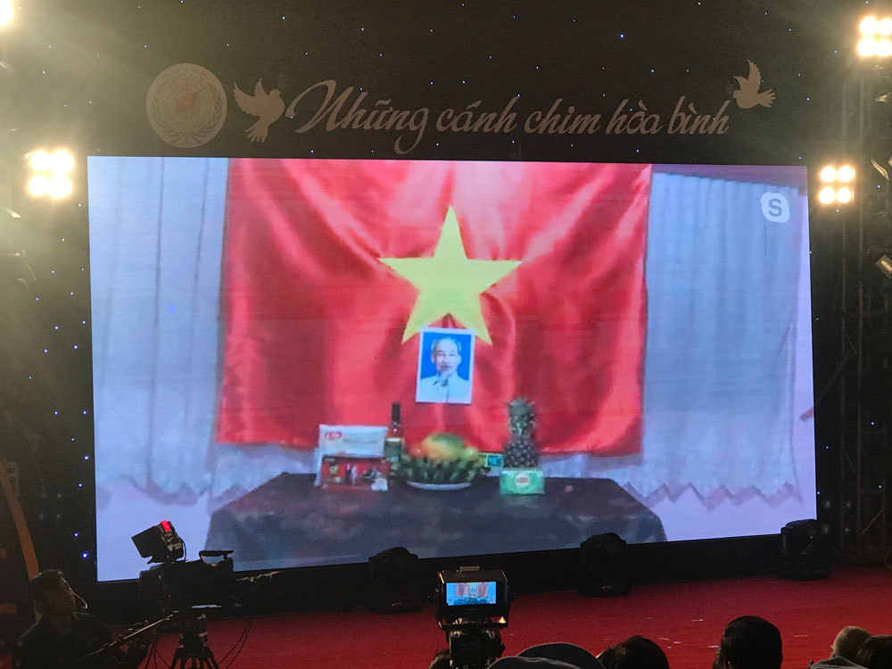 Trung tá Văn cho biết, tại CH Trung Phi, các quân nhân thuộc Phái bộ GGHB đã lập bàn thờ Tổ quốc, dự kiến gói bánh chưng mời đồng nghiệp các nước và người dân địa phương. Cả hội trường lặng đi xúc động khi anh quay camera cho thấy không gian sinh hoạt của Phái bộ và bàn thờ Tổ quốc với lá cờ đỏ sao vàng, ảnh Bác Hồ…