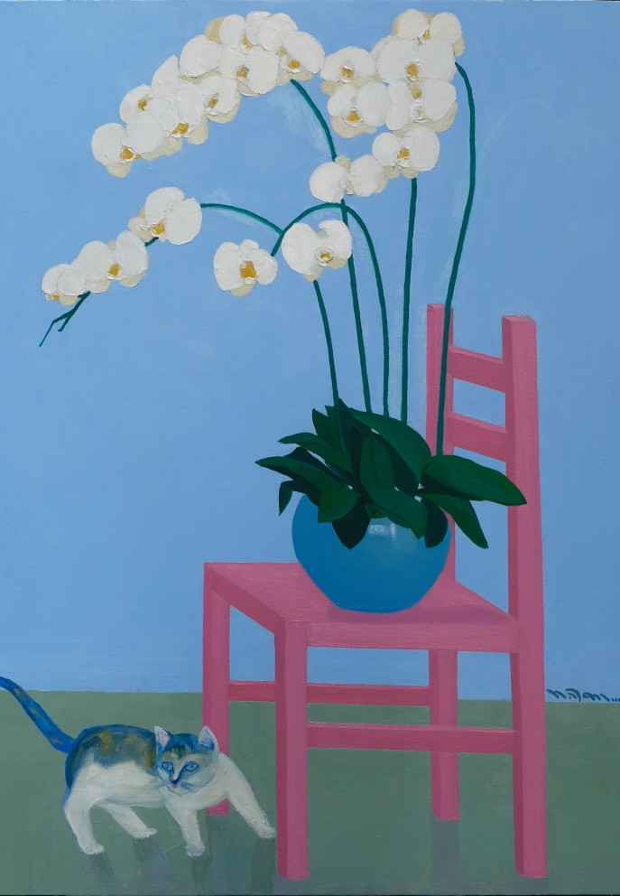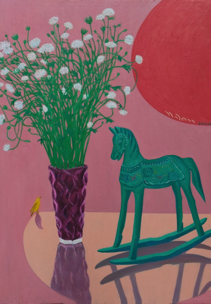 Với series tĩnh vật, họa sĩ đưa đến những hình ảnh thân thuộc, gợi nhắc ký ức mỗi người với lọ hoa, chậu cá, chú chim, mèo con, ngựa gỗ, mặt nạ…