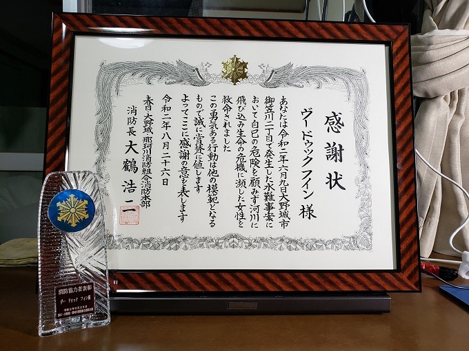 | Bằng khen và kỷ niệm chương của Sở Cứu hỏa và Cứu nạn tỉnh Fukuoka được Đức Huỳnh đặt trang trọng trên bàn học. |