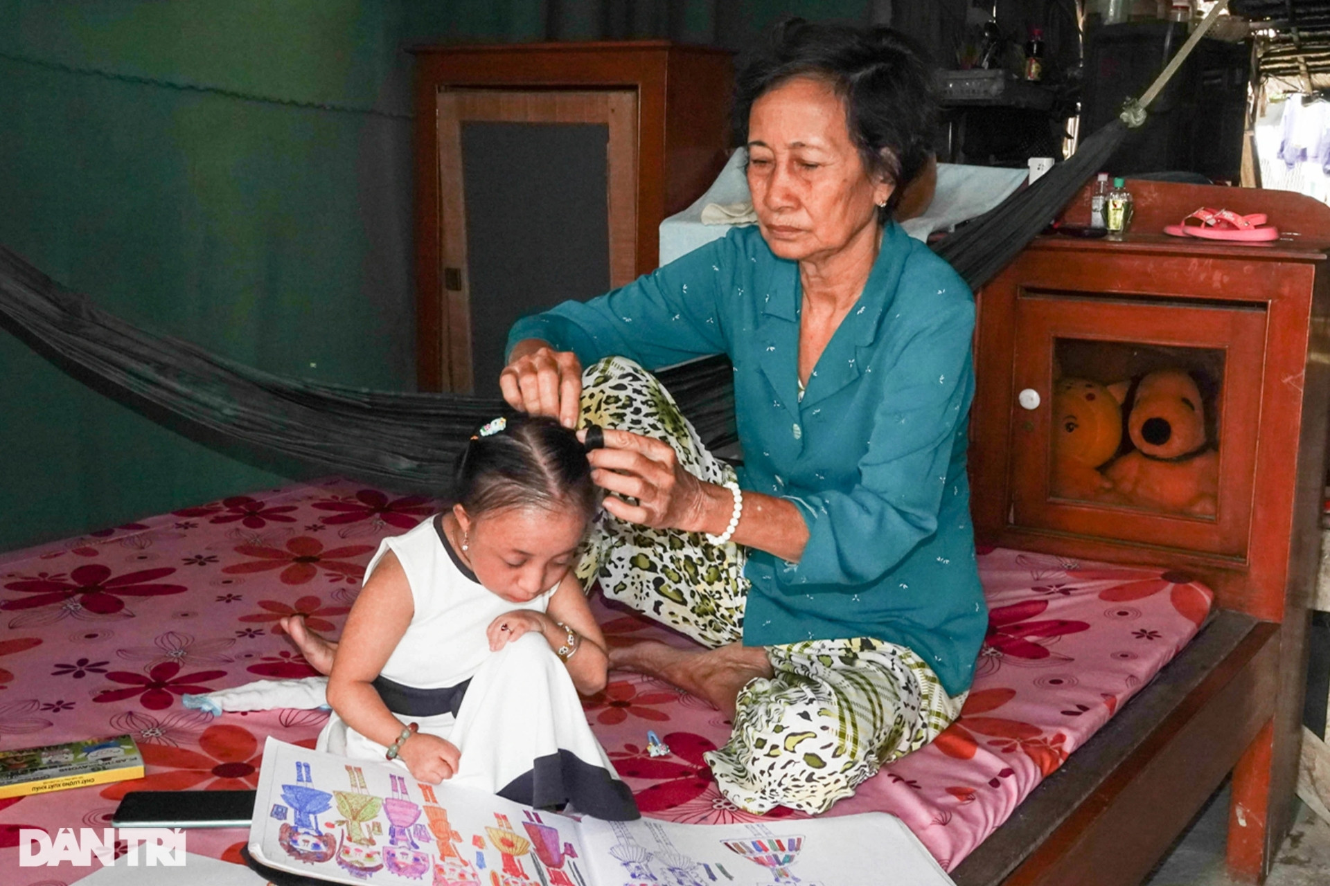"Khi xưa nhà tôi nghèo lắm, nhà lợp lá nên tới mùa gió lạnh thổi tạt vào nhà. Tôi phải lựa chỗ kín đáo cho cháu nằm, đôi khi gió lớn quá tôi sợ cháu bị thổi bay", bà ngoại Kim Ly tâm sự.