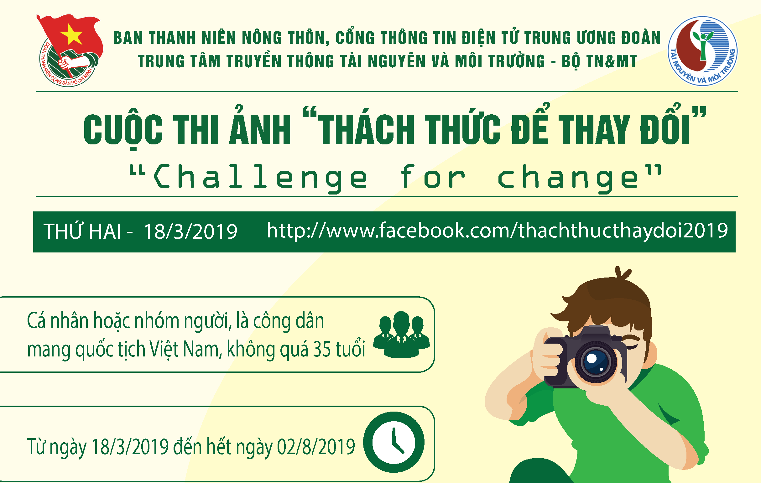 Cuộc thi ảnh “Thách thức để thay đổi” nhằm lan truyền mạnh mẽ thông điệp giới trẻ thử thách bản thân để thay đổi, hướng tới nâng cao nhận thức cộng đồng cùng chung tay vào các hoạt động tình nguyện bảo vệ môi trường.