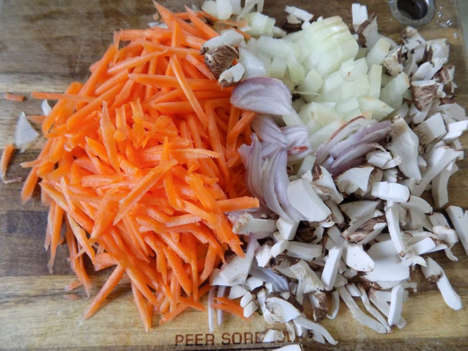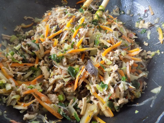 Miến ngâm nước cho mềm rồi thái khúc ngắn, cà rốt gọt bỏ vỏ rồi thái sợi nhỏ, nấm mèo ngâm nước chờ nở rồi vớt ra vắt ráo thái sợi. Bắp cải su và nấm đông cô thái nhỏ, tỏi và hành tím băm nhỏ.