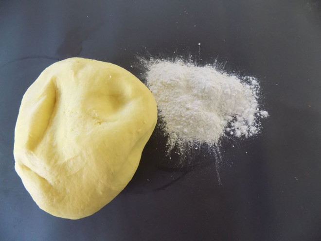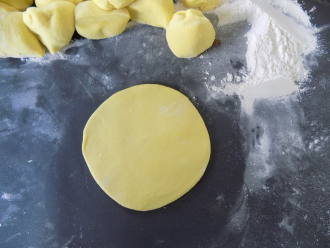 Bây giờ chúng ta lấy cục bột ra, nhồi sơ, chia thành những phần nhỏ (30 gr/1 bánh). Rắc chút bột mì lên bàn rồi cán mỏng cục bột theo hình tròn.