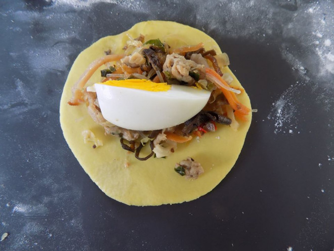 Tiếp đó, bạn cho nhân và trứng vào gấp đôi lại