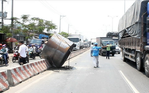 Thông tin từ hiện trường cho biết, xe đầu kéo 51C – 423.10 chở một cuộn thép lá nặng 20 tấn trên rơ moóc lưu thông theo hướng An Lạc về An Sương. Khi đến vị trí trên, dây buộc bất ngờ bị đứt, cuộn thép rơi tự do xuống đường đập vào dãy bê tông phân cách.
