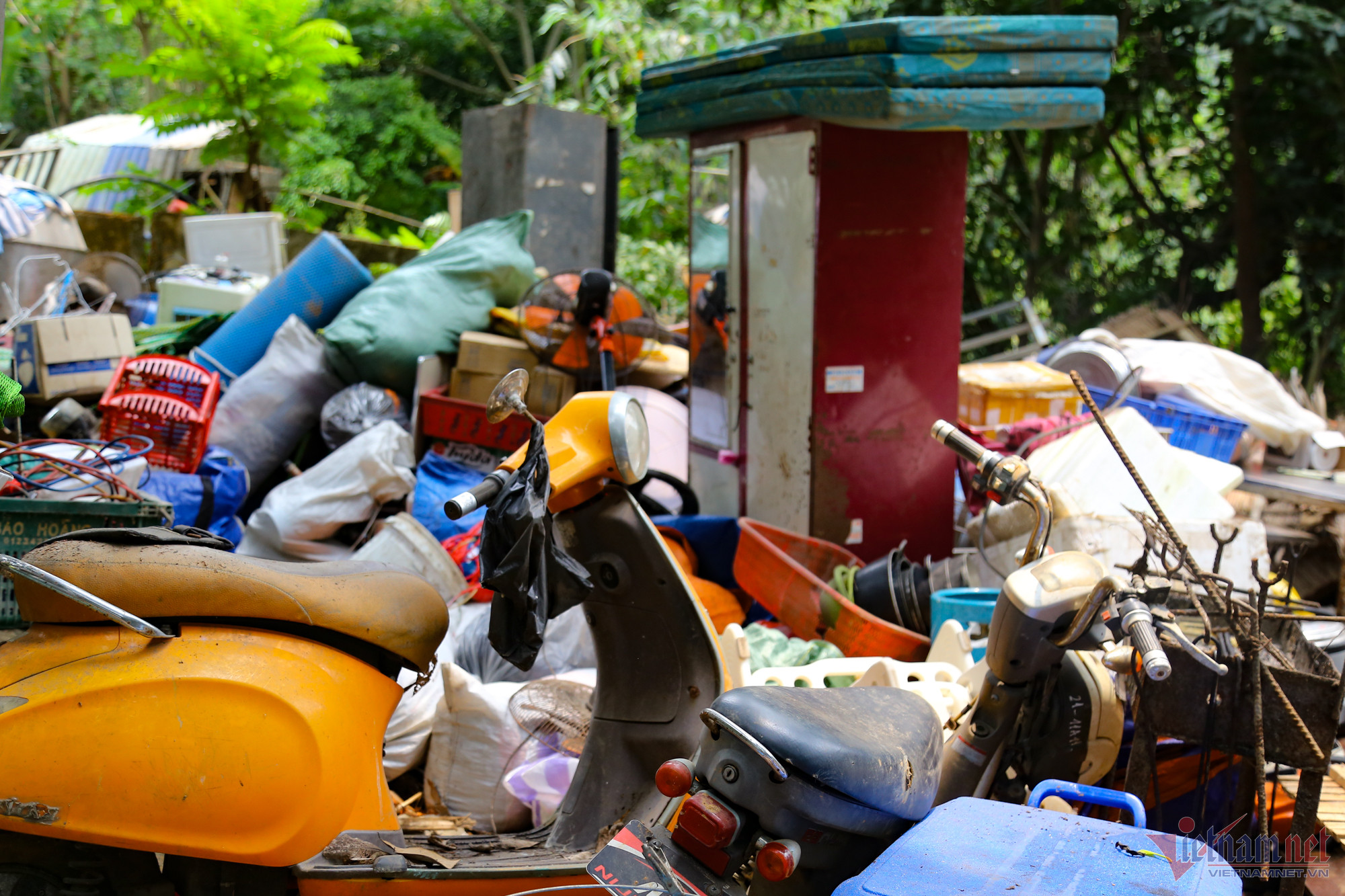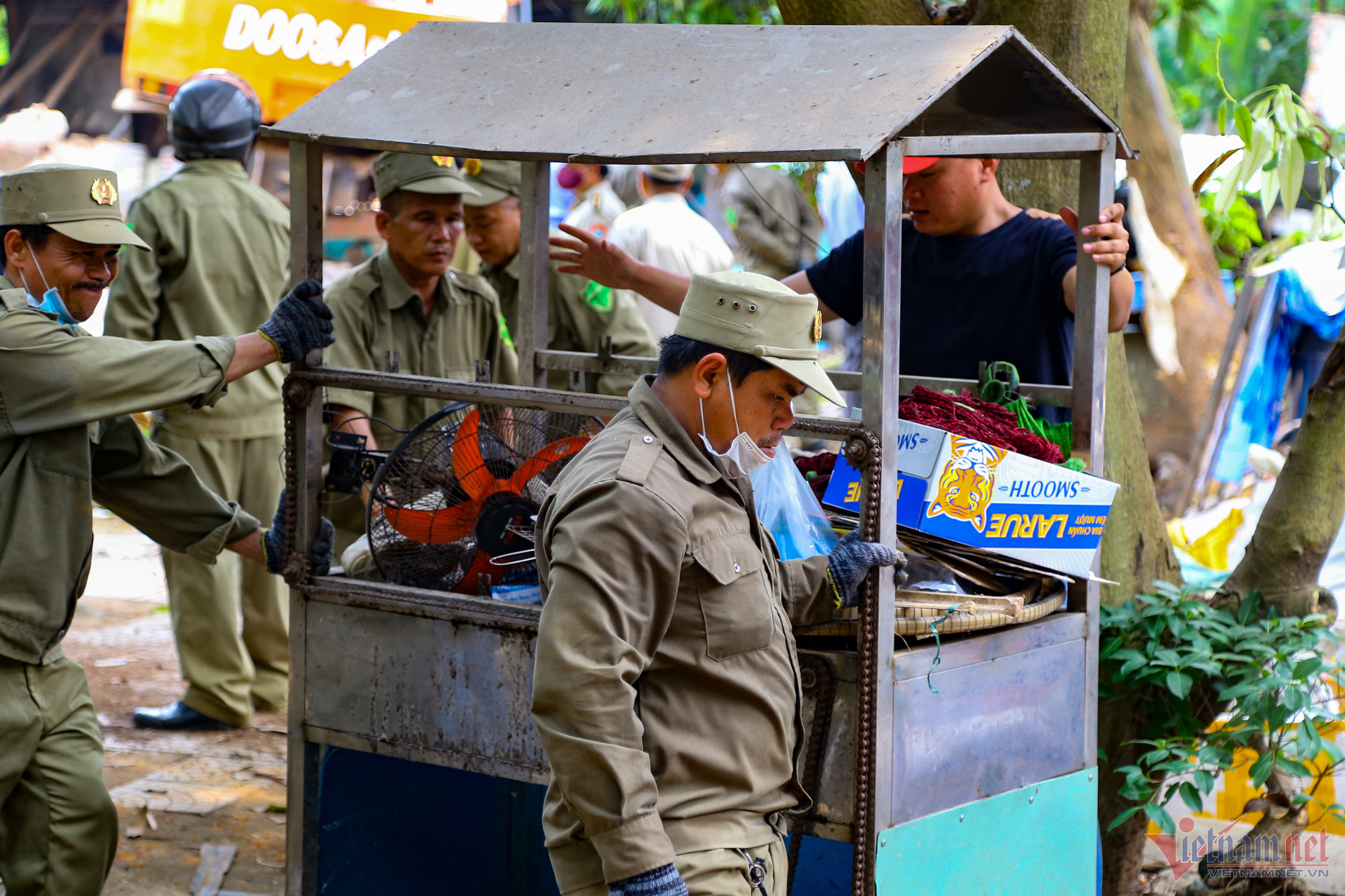 Tại quán nhậu Tuân Núi, lực lượng cưỡng chế huy động 2 máy múc cùng khoảng 50 người thuộc các lực lượng phối hợp tháo dỡ hệ thống nhà, sạp cũng như vận chuyển đồ đạc.
