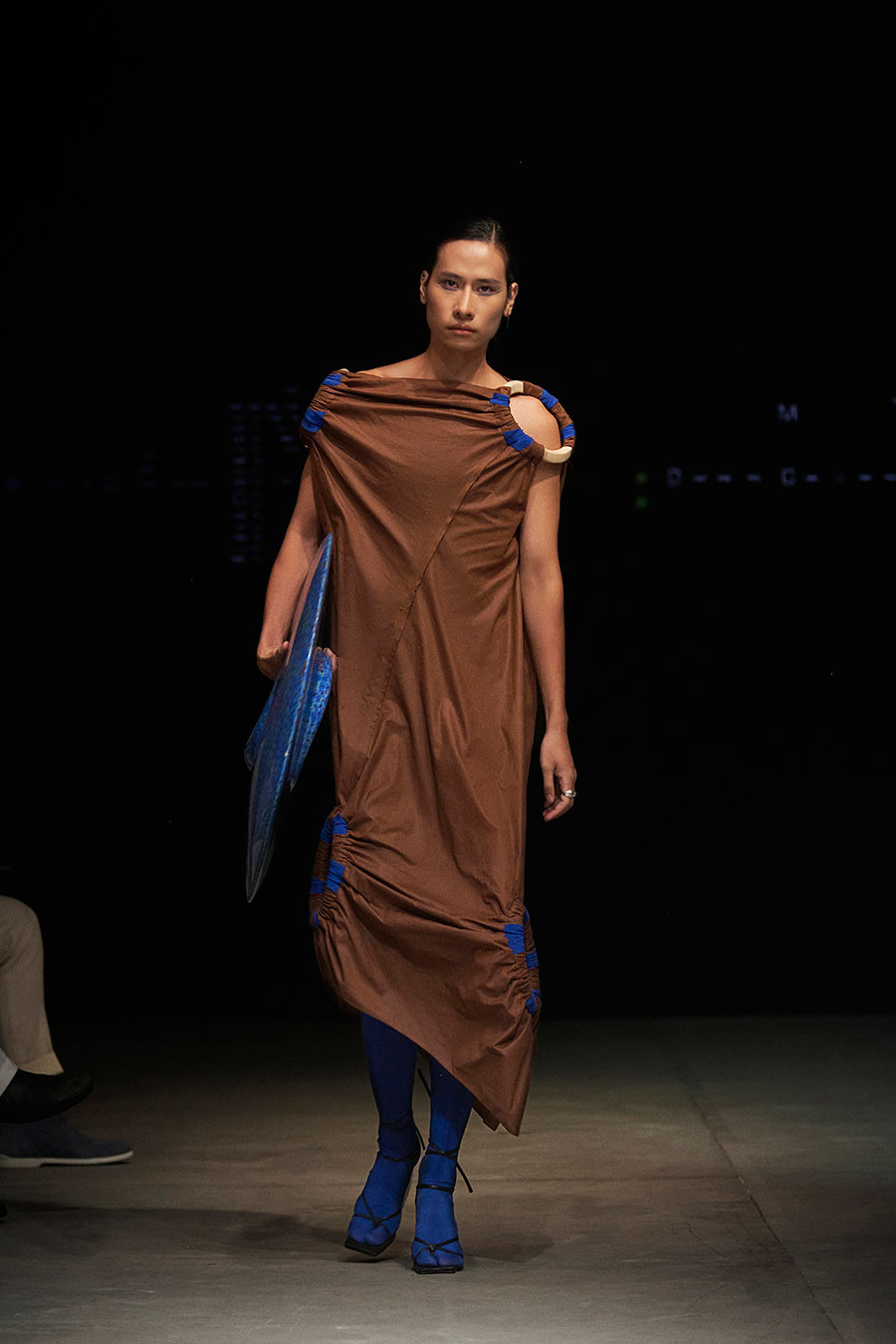 Vốn là sinh viên của Đại học Kiến trúc Hà Nội, Cường Đàm đưa nhiều yếu tố của kiến trúc vào trang phục, kết hợp cut-out - xu hướng hot nhất thế giới hiện nay, tạo nên những chiếc đầm phi cấu trúc, phi giới tính.
