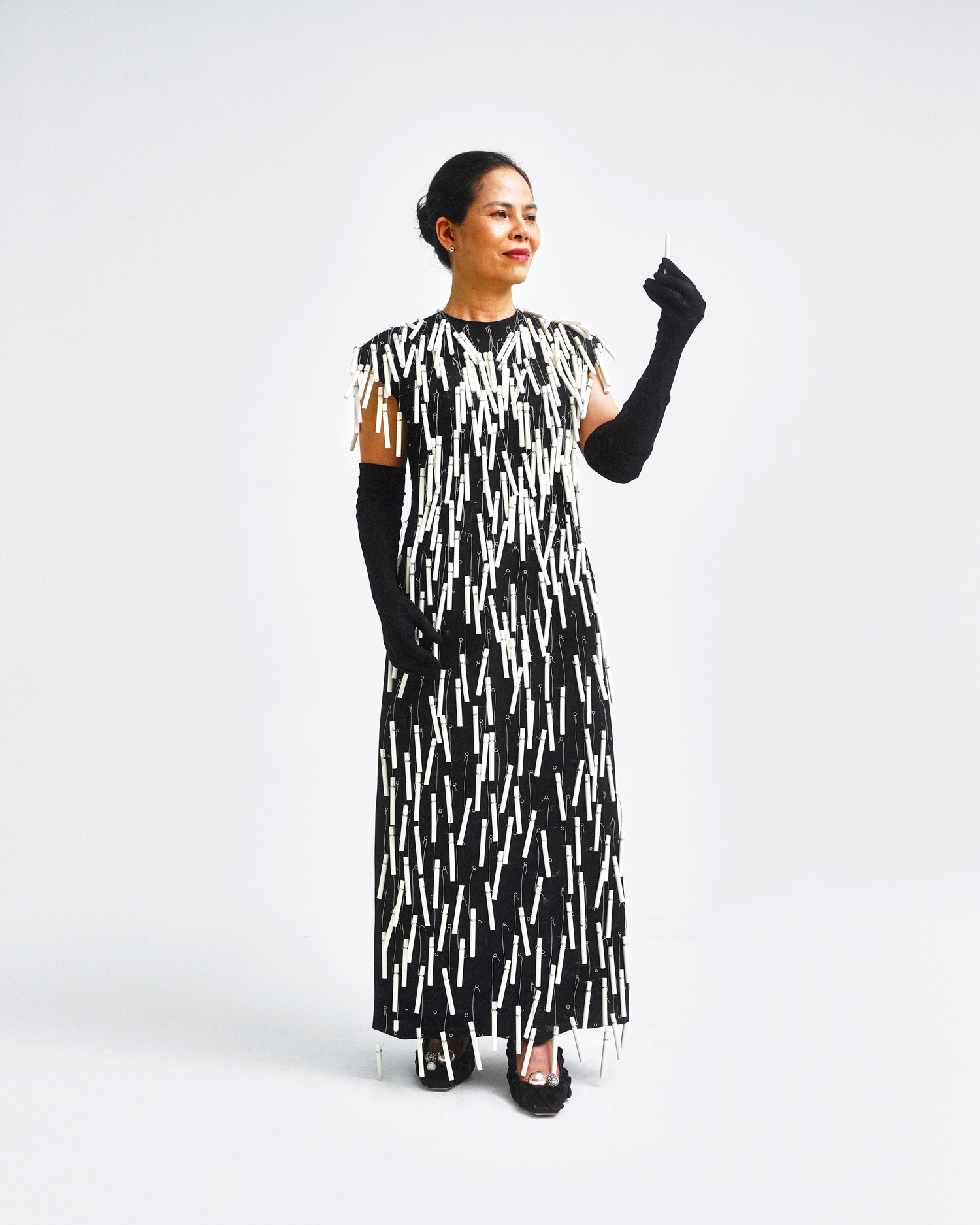 Với đầm suông đen cho mẹ, nhà thiết kế kỳ công gắn hàng trăm viên phấn trắng dọc thân váy, tạo nên hình khối độc đáo và sự tương phản về màu sắc.