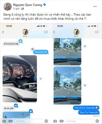 Trên Facebook cá nhân, doanh nhân Nguyễn Quốc Cường chia sẻ việc sẽ tặng Đàm Thu Trang chiếc Porsche 911 GT3 mới tậu. Theo đó, sau khi cầm lái chiếc 911 ra đường, Đàm Thu Trang đã chụp lại và gửi cho chồng cùng lời nhắn: "Đi khá thích đấy. Xe xịn ghê". Doanh nhân từ phố núi cũng nhanh chóng đáp: "Hợp với Thu Trang đấy. Tặng Thu Trang luôn".