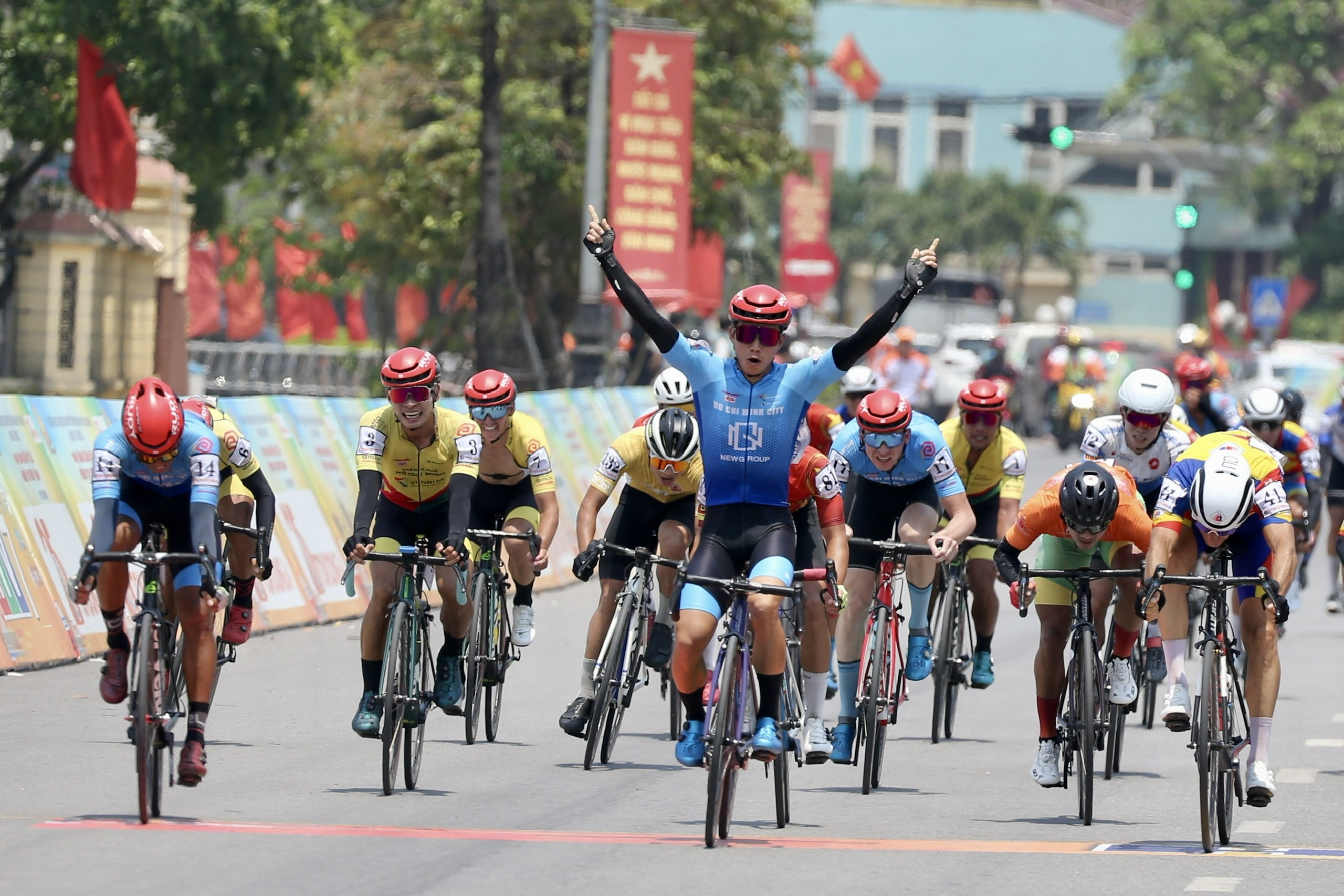 Gần đích Nguyễn Văn Bình với cú nước rút mạnh mẽ, vươn lên giành ngôi thắng chặng mang về niềm vui đầu tiên đến với đội xe đạp TP.HCM ở Cúp truyền hình 2023.
