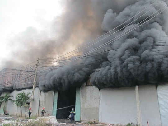 Sau hơn 3 giờ chữa cháy, đến 21 giờ ngày 16/7, kho chứa vải vụn bên trong công ty TNHH Thương mại VEGA, số 501, Quốc lộ 1 (P. Linh Xuân, Q. Thủ Đức, TPHCM) vẫn còn rực lửa.