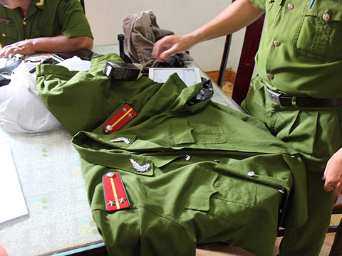 Cơ quan công an đưa D. về trụ sở làm việc. Tại đây, công an thu giữ một bộ trang phục Cảnh sát cấp hàm Thiếu tá, 1 còng số 8, 1 CMND dán ảnh D. mặc trang phục CSGT cấp hàm Đại úy và 7 bộ hồ sơ xin việc.