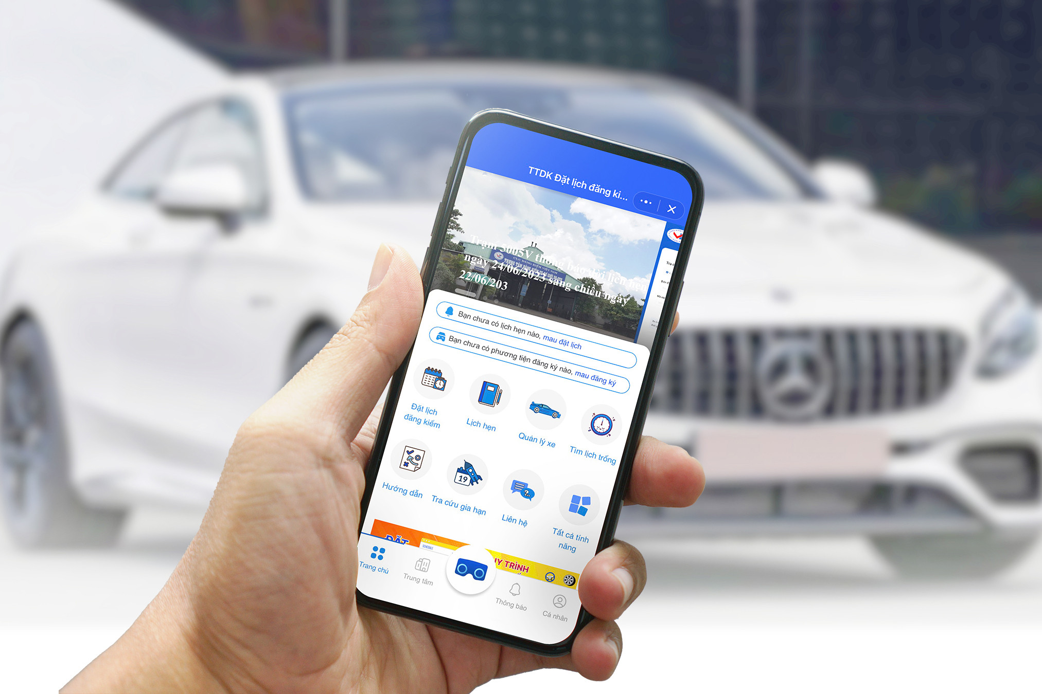Khi đã hoàn tất xác nhận thông tin phương tiện, chủ xe sẽ được ứng dụng cho phép chọn khu vực đăng kiểm phù hợp. Danh sách trung tâm đăng kiểm thuộc tỉnh/thành phố và ngày giờ còn trống sẽ được hiển thị để người dùng lựa chọn. Chủ phương tiện chỉ cần đến đúng thời gian, địa điểm trung tâm đăng kiểm đã hẹn trên app.