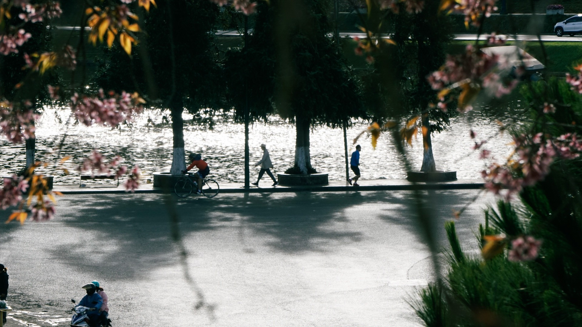 Những con đường trở nên thênh thanh, mặt hồ nắng chiếu lấp lánh, những cây mai anh đào hồng rực gió thổi đung đưa. Lác đác chỉ có vài bóng người cùng xe cộ. Người dân Đà Lạt thong thả dạo bước trong thành phố, hít thở bầu không khí và tận hưởng không gian yên tĩnh, bình yên hiếm có này.