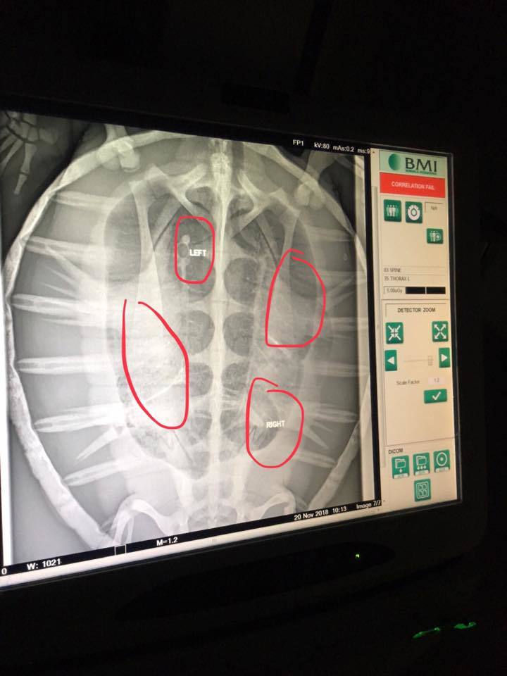 Qua chụp X Quang, nhóm phát hiện trong hệ tiêu hóa vích đầy dị vật như nhựa, xốp, búi cước, các loại rác thải du lịch này là nguyên nhân vích không ăn được, do đó cần đưa ra Đà Nẵng để nội soi gắp dị vật.