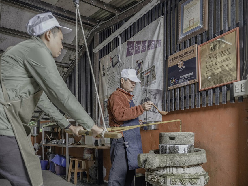 Xưởng của ông Liu biểu diễn cách làm đậu thủ công theo phương thức truyền thống để khách tham quan hiểu rõ hơn về sự khác biệt. Đậu được ngâm qua đêm và sau đó xay bằng cối đá. |