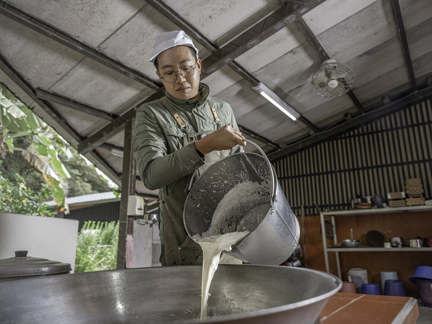Nhiều hộ dân trong làng mở nhà hàng chuyên các món về đậu phụ, hoặc tổ chức các lớp dạy nấu ăn dựa trên nguyên liệu này. Trong ảnh, ông Lin Yih-Cheng đang ngồi ngoài xưởng làm đậu hữu cơ của mình. |
