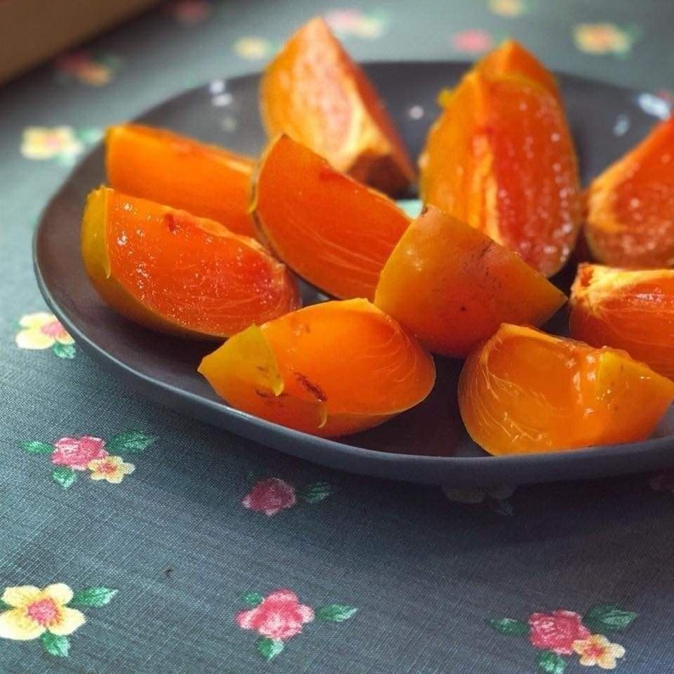 Khi chín, quả hồng da tre có phần thịt mọng, màu như trứng lòng đào, trong veo, ăn mềm nhưng không bị nhão. Loại hồng này nếu để lạnh trước khi ăn độ một giờ thì hương vị lại càng ngon hơn (Ảnh: Nhà hàng Bể cá)