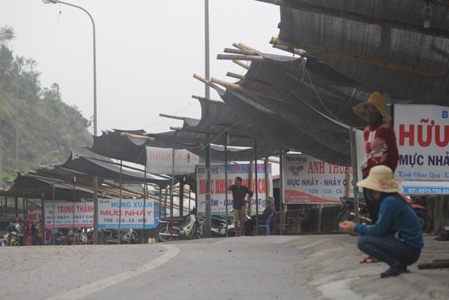 Hình ảnh quán xá vắng khách, người làm ngồi chơi tại 18 hộ kinh doanh mực đặc sản cảng Vũng Áng trưa 22/4: