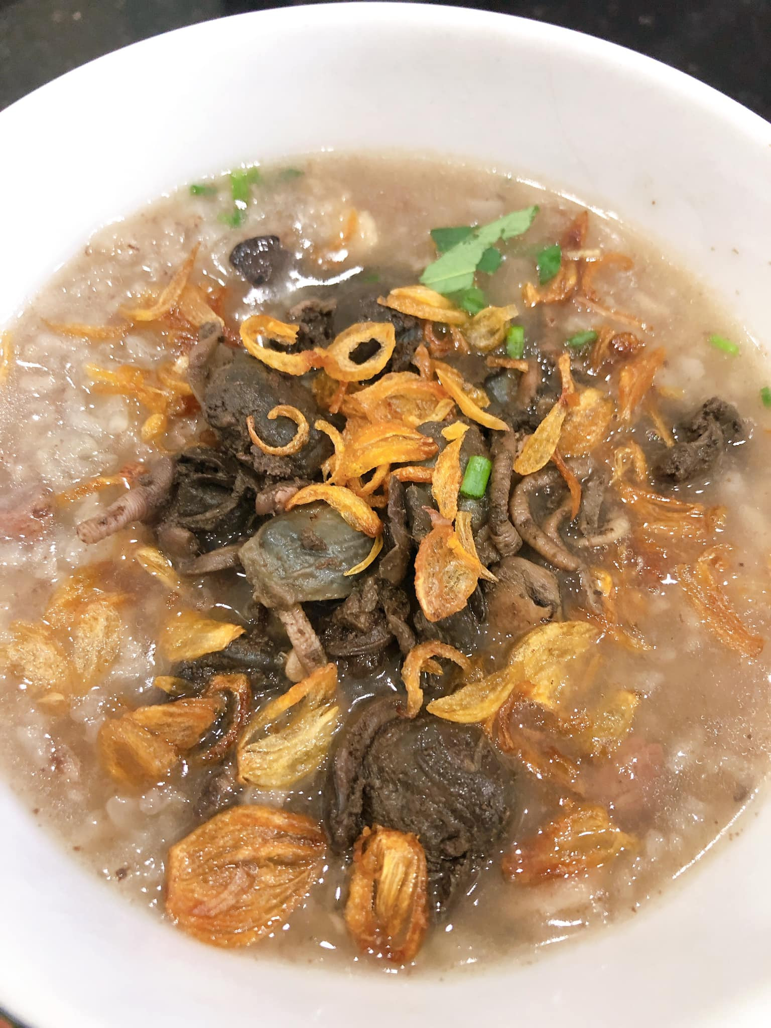 Cháo ngán ngon nhất khi ăn nóng, có xuất hiện những chấm nâu li ti từ tiết của con ngán chảy ra. Phần tiết này ăn bùi, thơm, ngậy, còn phần ruột ngán giòn, mềm, vị ngọt (Ảnh: Tâm Anh, @Huongbeatric, @trang_89).