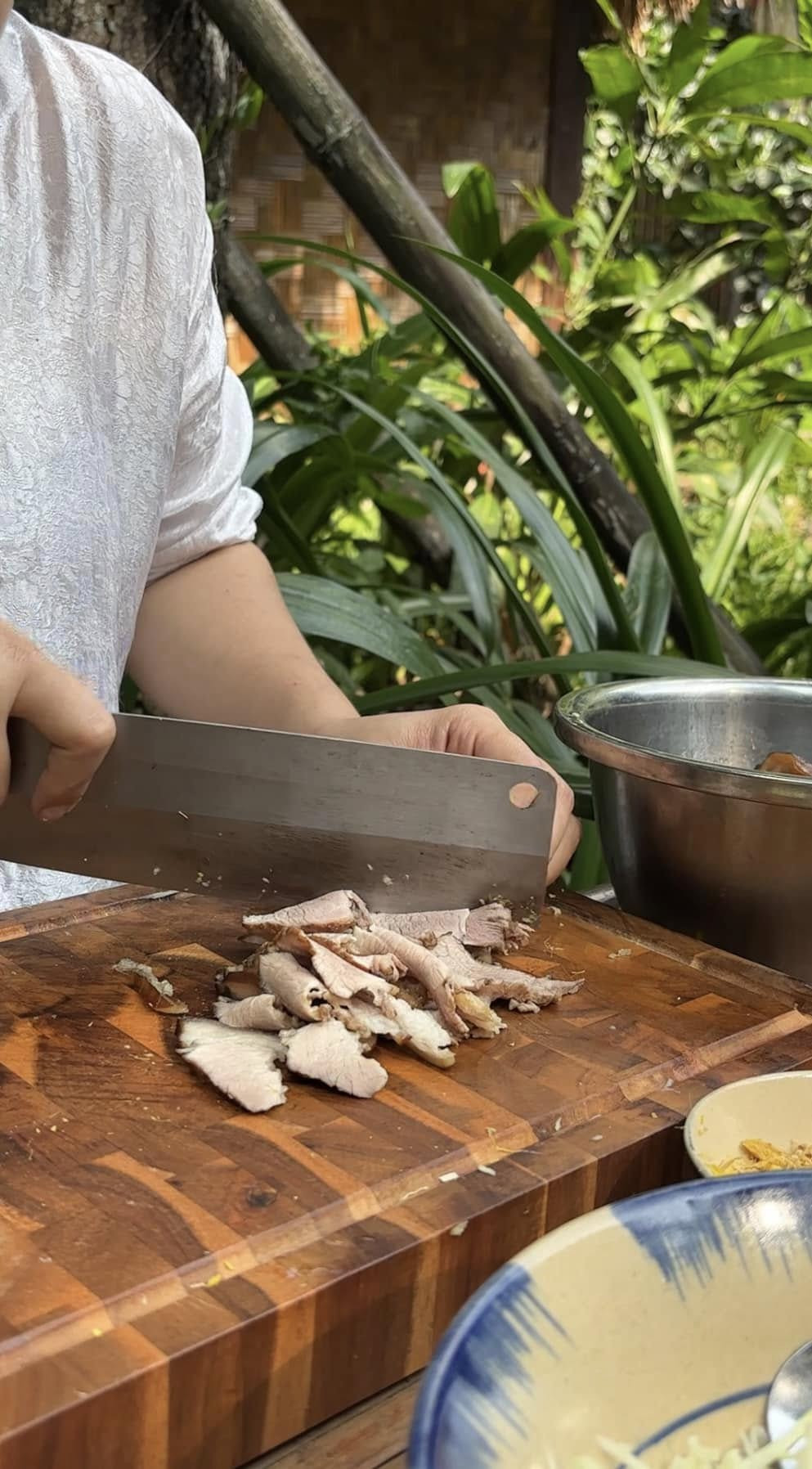Tiếp đến, người ta thái thịt chân giò thành các miếng thật mỏng. Công đoạn này đòi hỏi chút khéo léo sao cho thịt được thái đều tay, dính liền với da, vừa ngon, vừa đảm bảo thẩm mỹ.