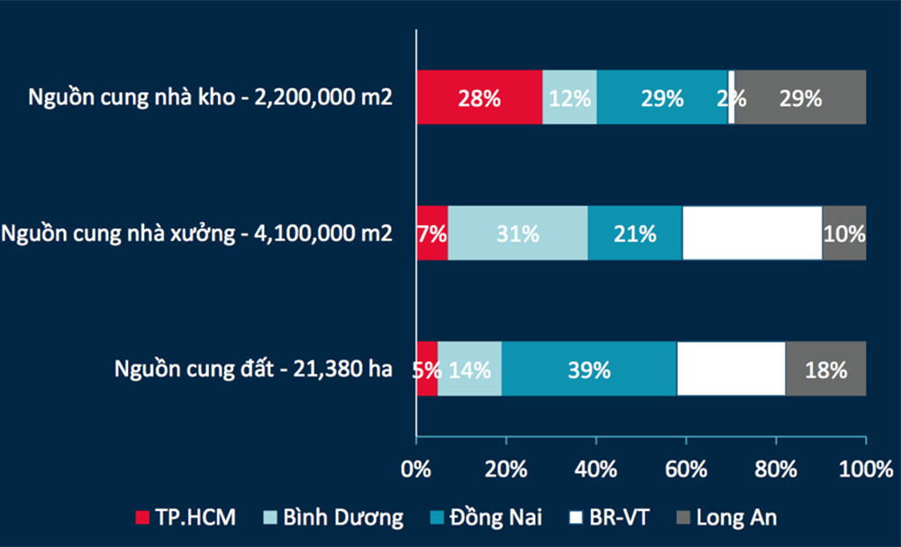 Theo bà Đỗ Thị Thu Hằng, Giám đốc cấp cao của Công ty nghiên cứu Savills Việt Nam, các khu công nghiệp tại TP.HCM, Bình Dương và Đồng Nai còn rất ít diện tích trống. Tỷ lệ lấp đầy tại 6 tỉnh, thành trọng điểm phía Nam ghi nhận mức 84% với giá thuê trung bình xấp xỉ 3,5 triệu đồng/m2/chu kỳ thuê 50 năm.