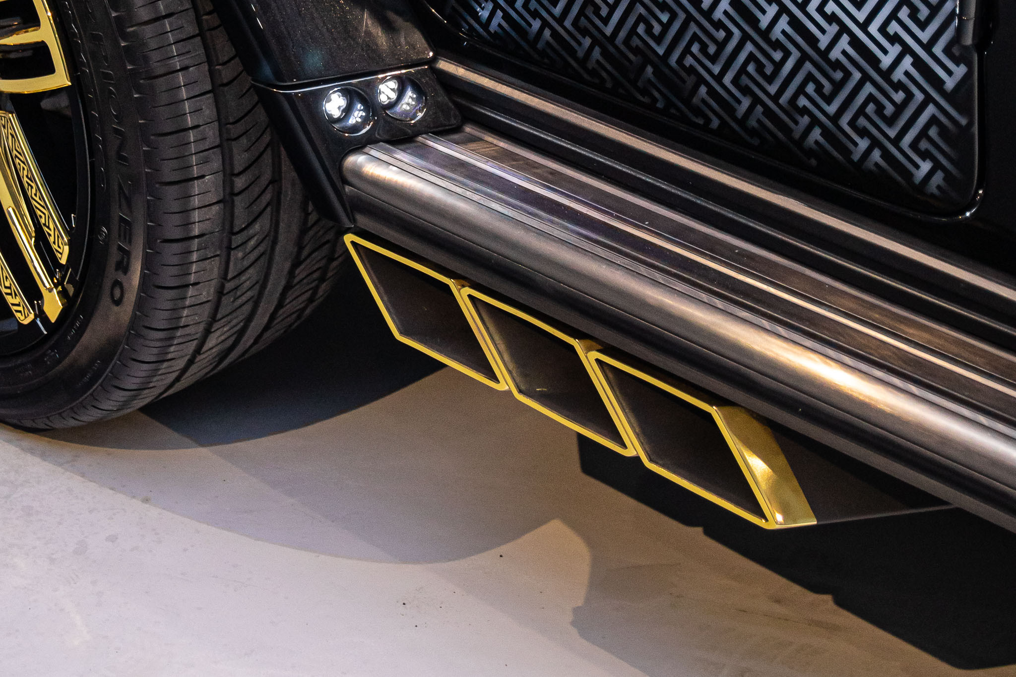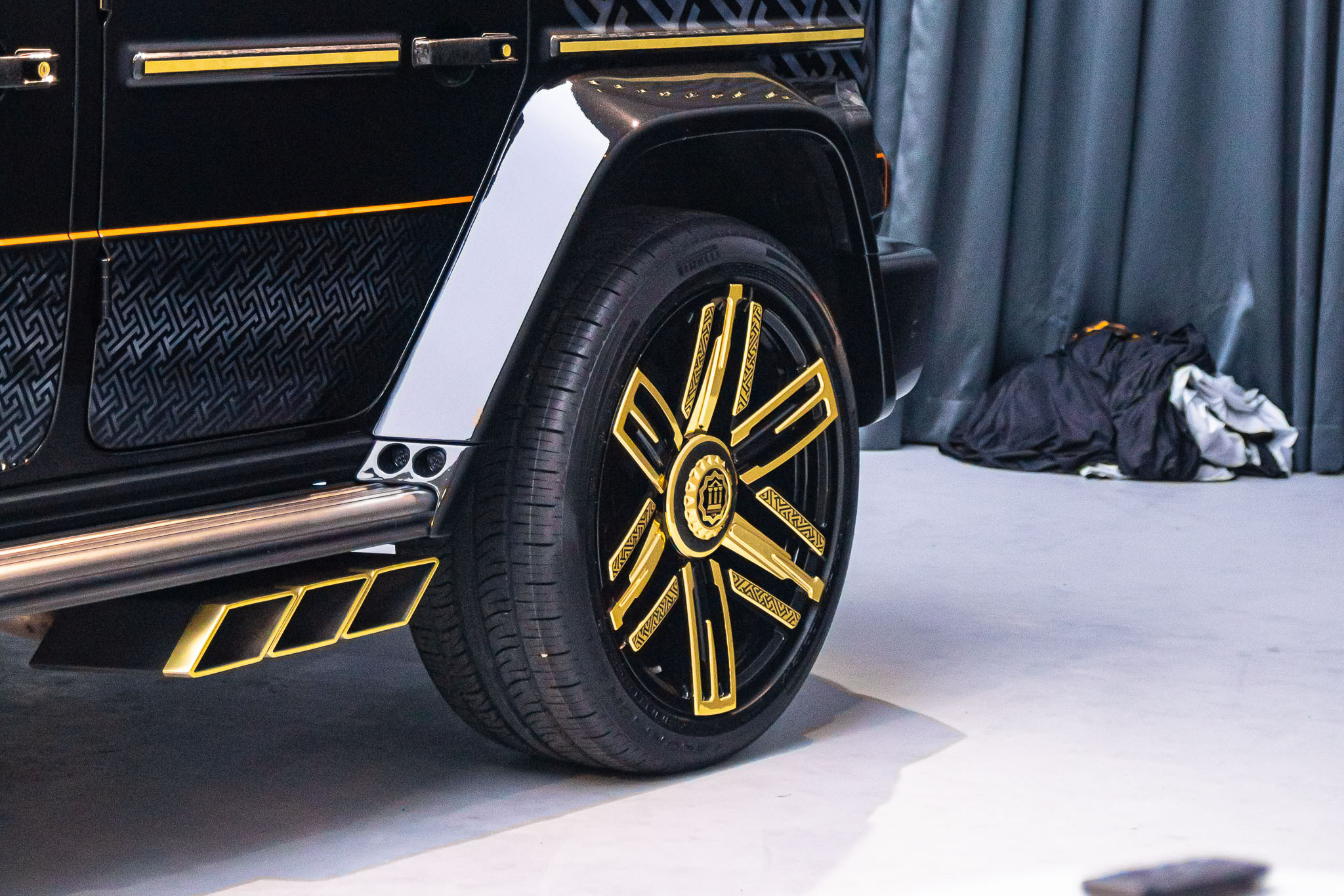 Một điểm nhấn khác trên chiếc Mercedes-AMG G 63 mạ vàng bản Heritage Edition là bộ mâm kích thước 22 inch, mạ vàng 22K kết hợp cùng tông màu đen. Đây cũng là thành quả của sự hợp tác giữa nghệ nhân Việt và thương hiệu sản xuất la-zăng xe của Singapore.