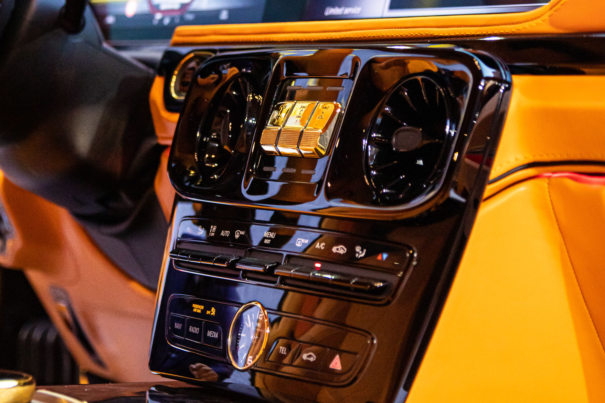 Màng loa của Burmester cao cấp của xe cho đến khóa chốt cửa, nút bấm chỉnh ghế, nút chỉnh kính hay lẫy chỉnh cửa gió điều hòa hàng ghế sau cũng mạ vàng, điều đó cho thấy sự tỉ mỉ đến từng chi tiết nhỏ của bản độ độc lạ này.