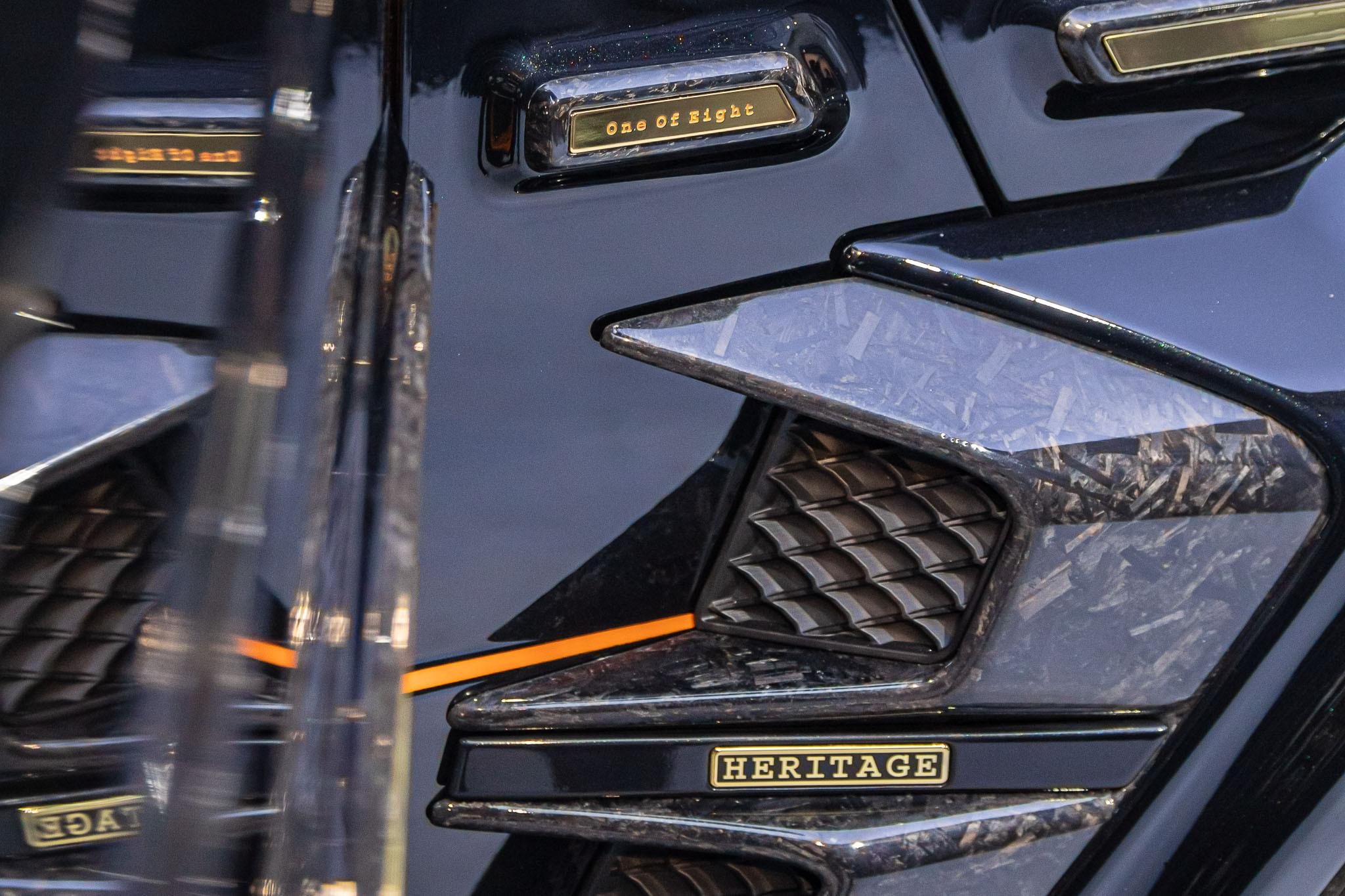 Vòm bánh trước thay thế logo Brabus hay AMG bằng dòng chữ “Heritage” và “One Of Eight” – đánh dấu cho một trong tám chiếc G 63 của bản độ này.