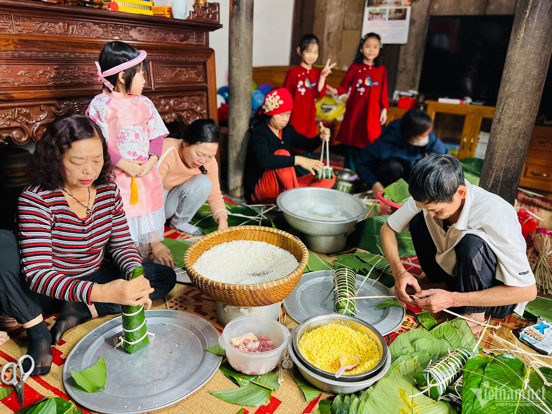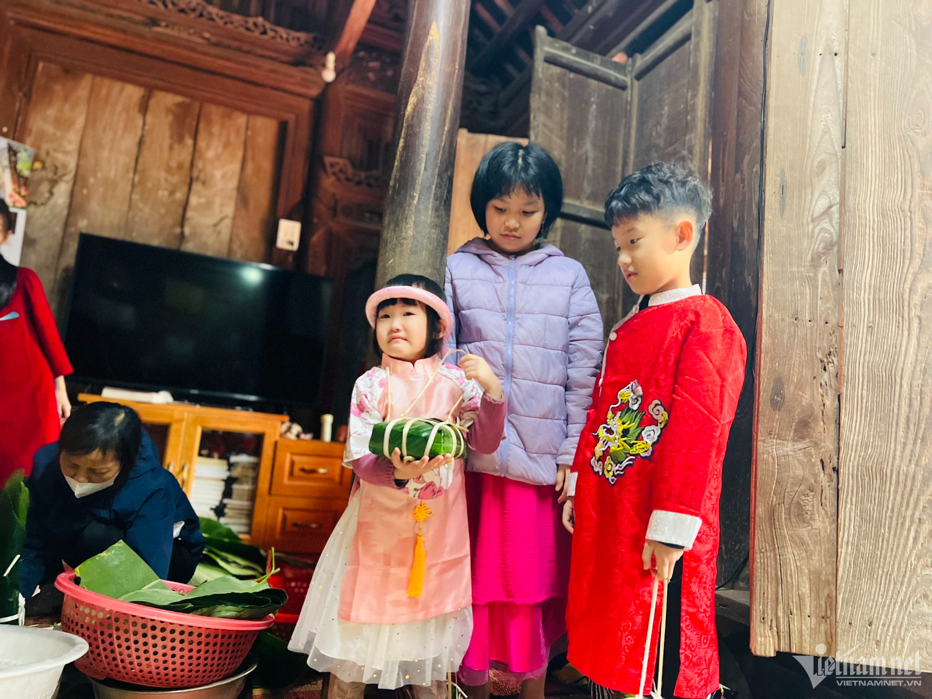 Phía sau lưng nhà ông Bân là ngôi nhà cổ hơn trăm năm tuổi, nơi vợ chồng bà Phương đang sinh sống. Đã 33 năm kể từ khi về làm dâu, bà Phương duy trì truyền thống đại gia đình quây quần gói bánh chưng đón tết Nguyên đán. Một điều thú vị, bà luôn ưu tiên gói bánh chưng con cho các cháu, chắt có bánh đeo cổ để vui chơi thỏa thích.