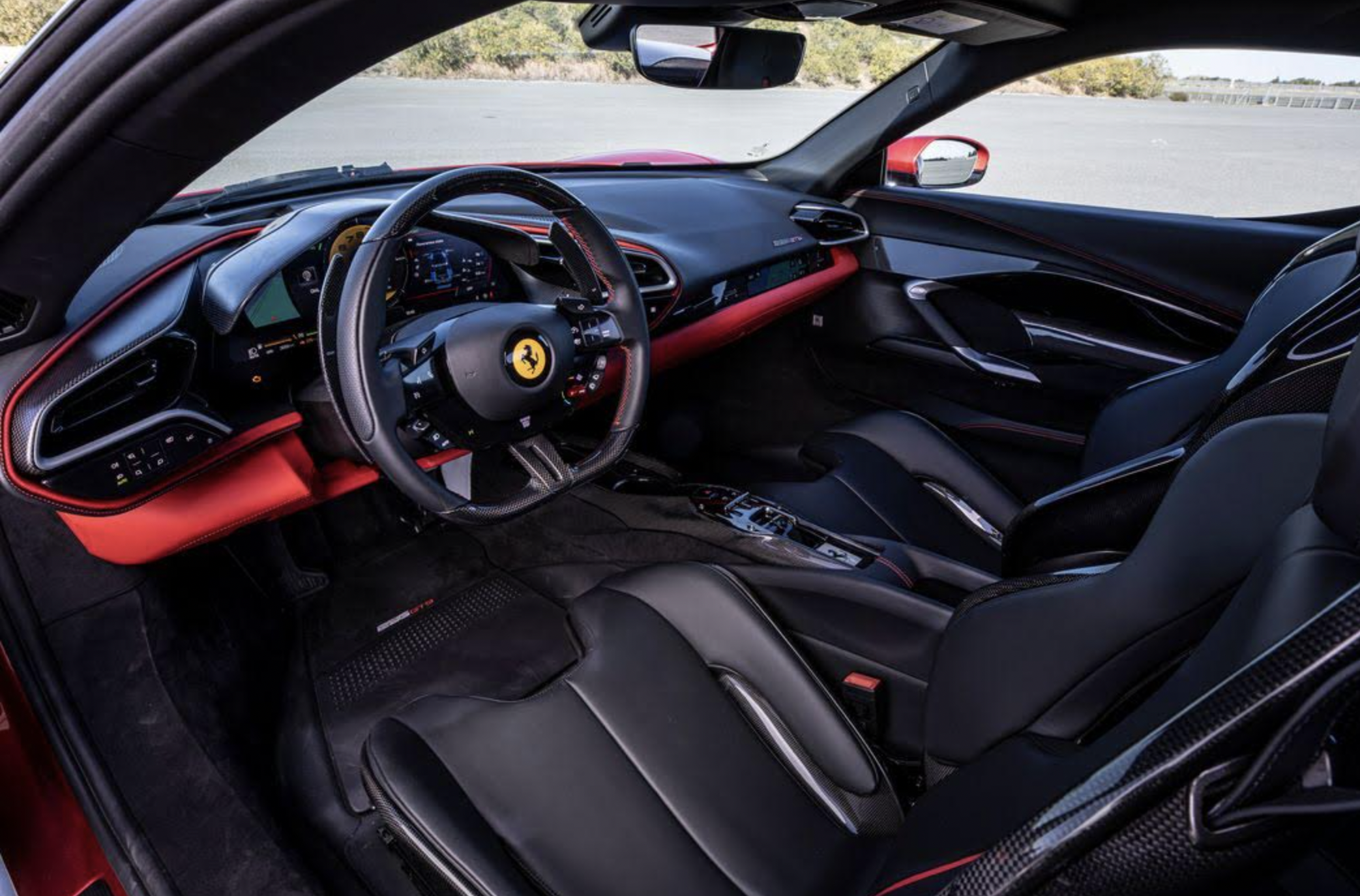 Bên trong khoang nội thất là thiết kế đơn giản vốn có của Ferrari. Cửa gió điều hòa góc cạnh thay cho kiểu tua-bin truyền thống ở F8 hay 488. Màn hình giải trí không có ở trung tâm như dòng Roma, thay vào đó là tập trung vào trải nghiệm của người lái. Khách hàng có thể chọn thêm một màn hình nhỏ bên táp-lô ghế phụ.