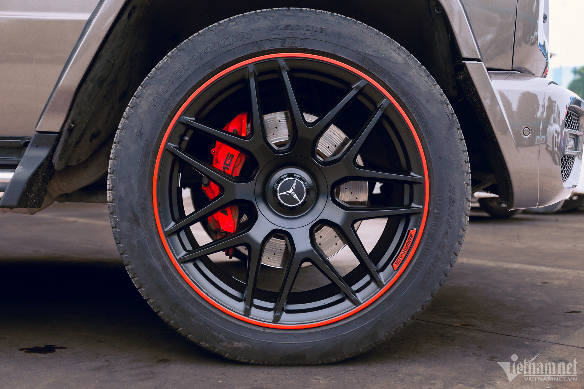 Bộ mâm 5 chấu kích thước 20 inch, thiết kế dạng ngôi sao của xe được chủ xe nâng cấp lên bộ mâm đa chấu dạng chữ Y sơn đen mờ, viền sơn màu đỏ và có kích thước 22 inch. Phía trong nổi bật với cùm phanh AMG sơn đỏ.