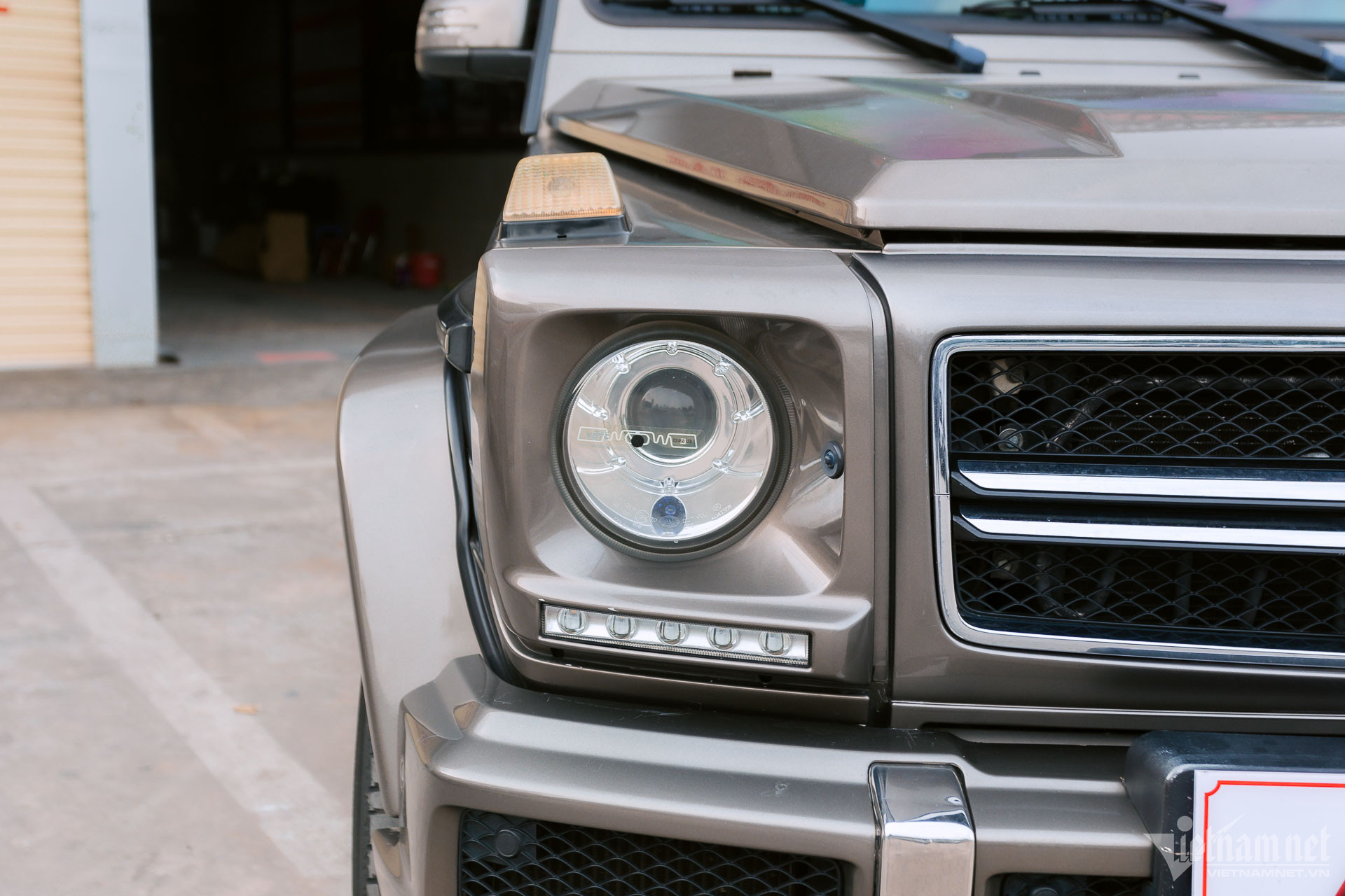 Những thay đổi chủ yếu tập trung ở đầu xe, với cản trước gồm ba hốc gió mang đường nét thiết kế mềm mại hơn xe nguyên bản vốn vuông vức. Đi kèm là bộ ốp cản trước sơn màu tương phản – chi tiết không có trên G 63 2014. Đặc biệt, dải đèn LED định vị nằm dưới cụm đèn chiếu sáng ở G-Class tiền nhiệm được chủ xe chọn cách chuyển xuống hốc gió hai bên.