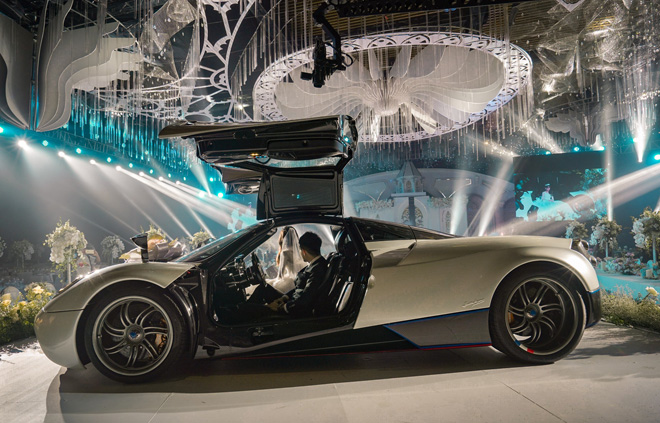 Ngay từ phần mở màn đám cưới, hai bố con Minh Nhựa và Minh Anh (tên thật của Joyce Phạm) đã khiến hàng trăm quan khách trầm trồ khi cùng tiến vào lễ đường bằng siêu xe Pagani Huayra.