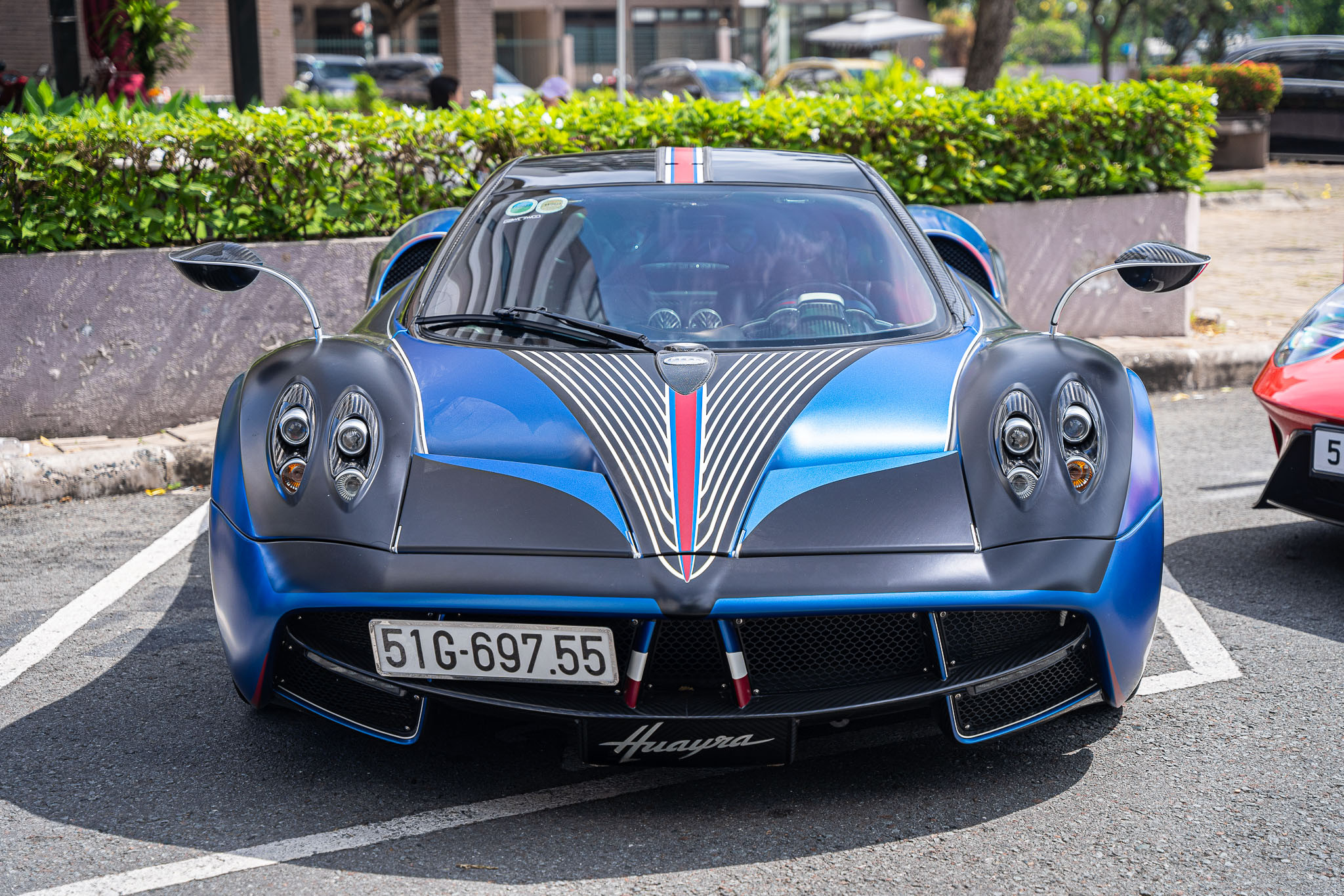 Tâm điểm của dàn siêu xe trị giá hơn 200 tỷ vẫn là chiếc Pagani Huayra của doanh nhân Phạm Trần Nhật Minh (Minh nhựa). Sau 7 năm về nước, chiếc xe đã đổi sang diện mạo mới bằng phương pháp dán decal, gồm hai tông màu chủ đạo là xanh và đen, điểm xuyết bằng những đường viền màu trắng và đỏ. “Bộ cánh” mới lấy cảm hứng từ luồng khí dẫn vào xe khi vận hành.