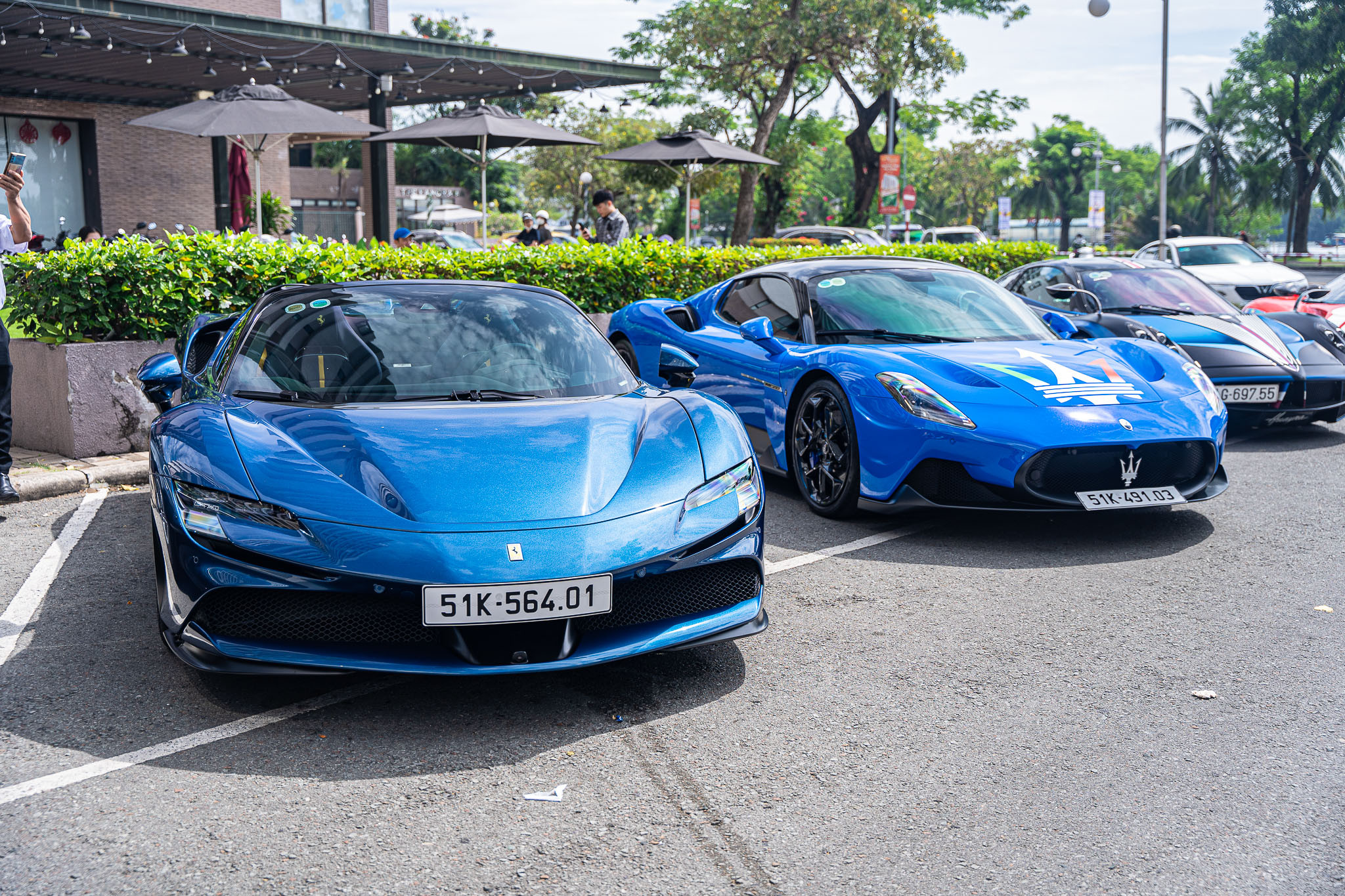 Siêu xe Ferrari SF90 Spider của Cường Đôla thu hút không kém bởi đây là dịp hiếm hoi xe xuất hiện trên phố kể từ khi ra biển số TP.HCM. Xe được nhập khẩu bởi nhà phân phối chính hãng, với ngoại thất màu xanh dương lạ mắt.