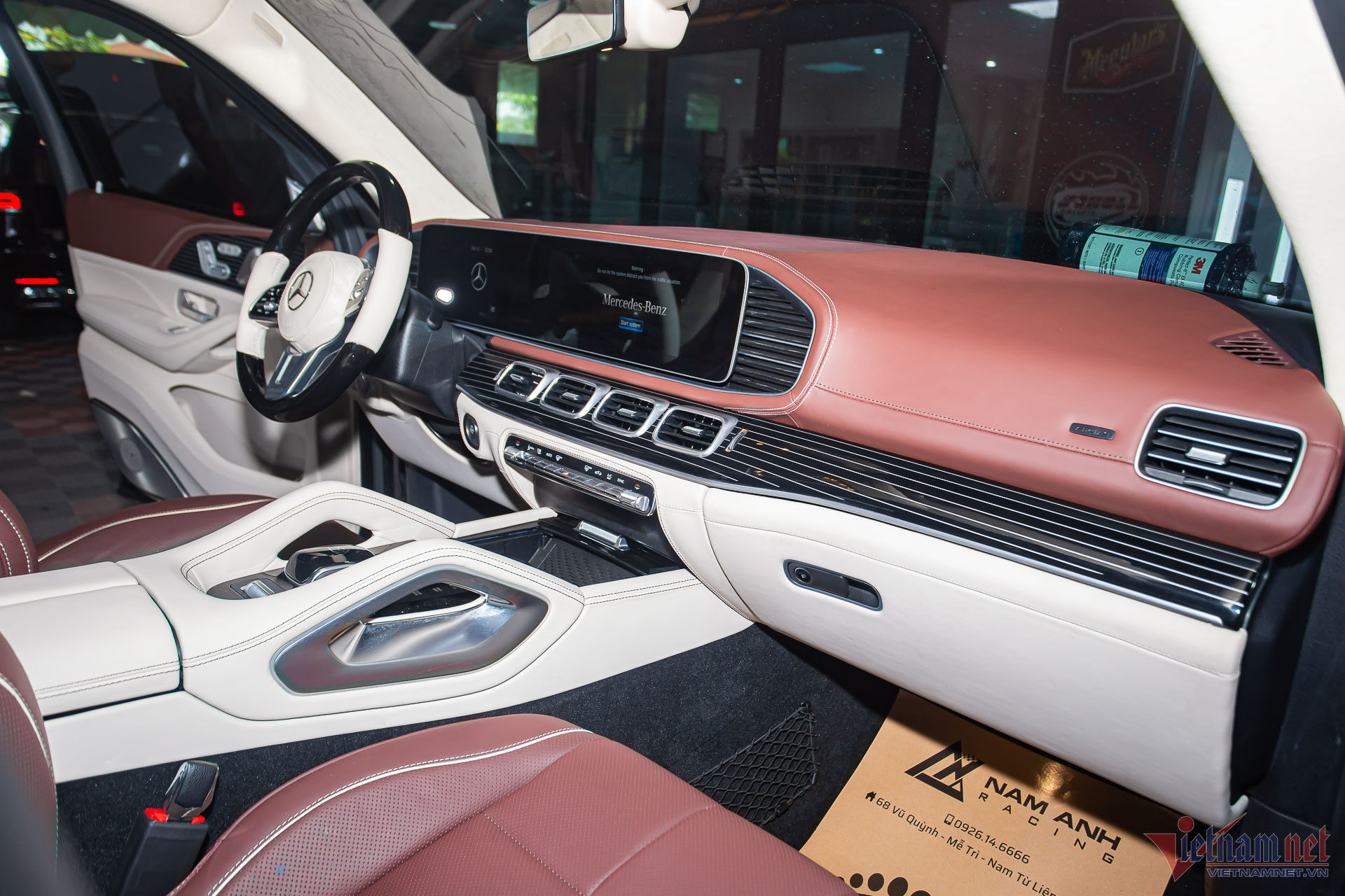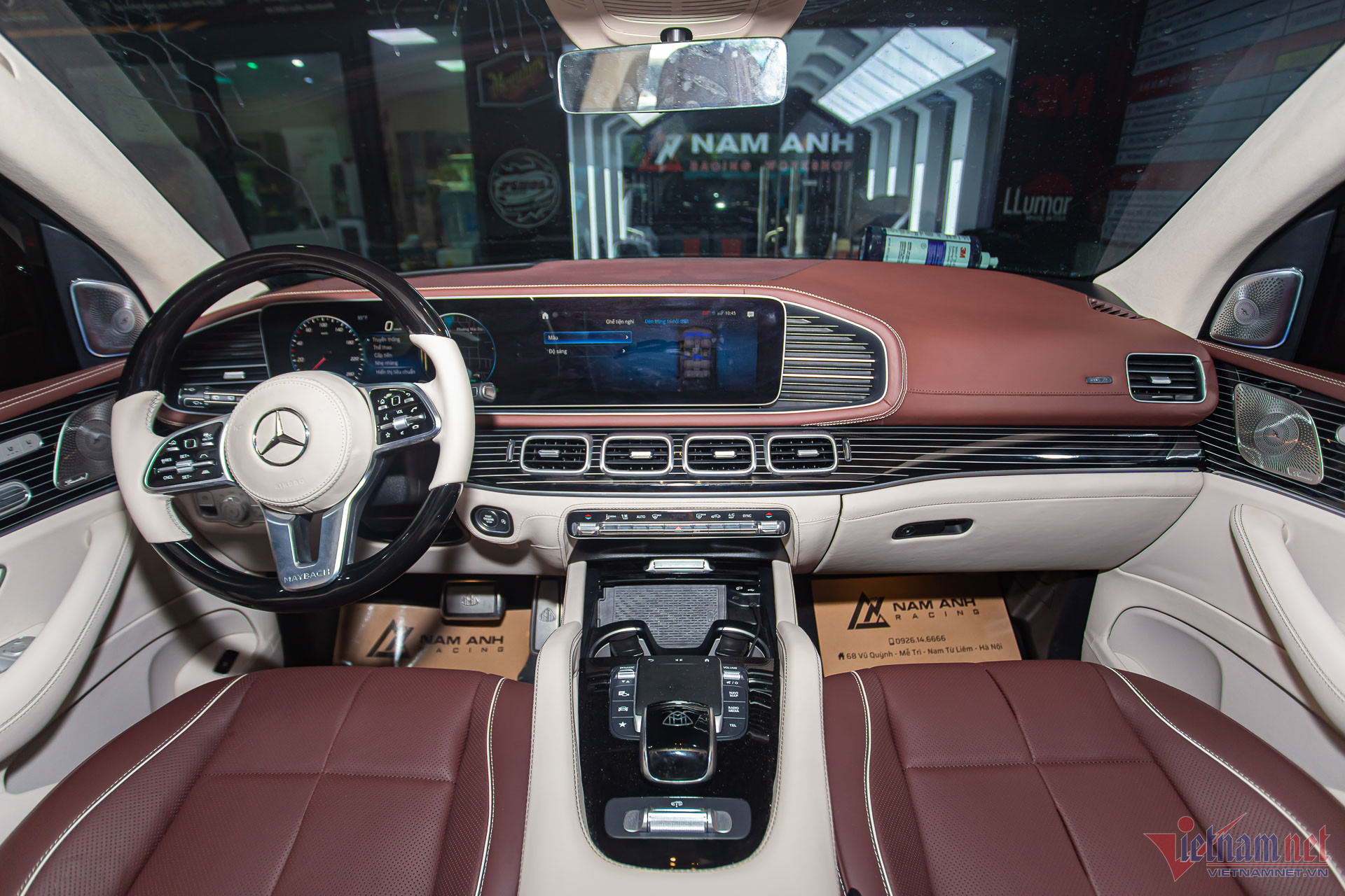 Không gian nội thất của Mercedes-Maybach GLS 600 khác hoàn toàn với GLS 450 thường, do đó chủ xe đã mạnh tay chi hơn 1,1 tỷ đồng để nâng cấp. Khoang lái và ghế ngồi bọc da Nappa, kết hợp giữa hai màu trắng và nâu đỏ, tạo điểm nhấn bằng những chi tiếp ốp gỗ Black Piano Lacquer.