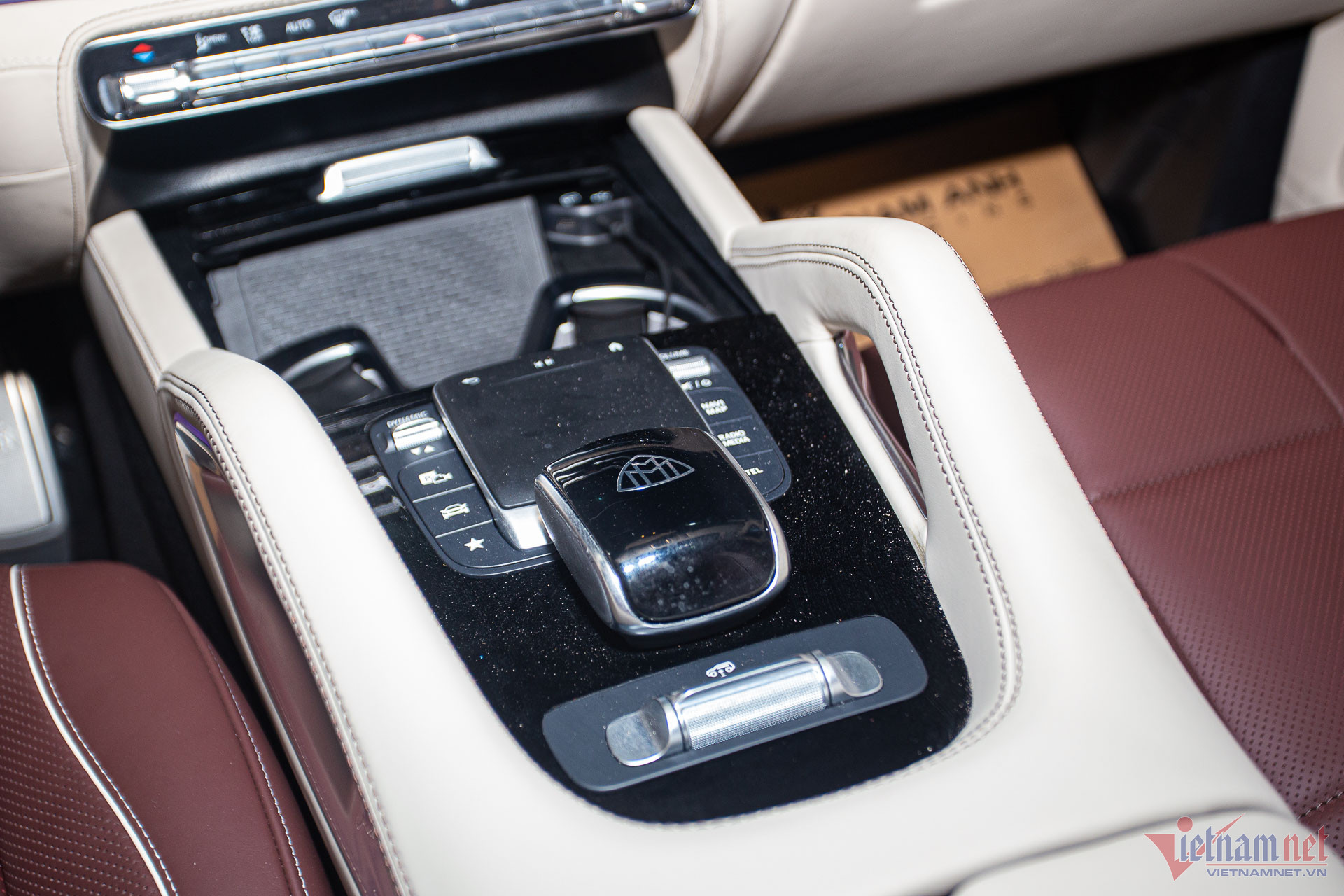 Ngăn cách hai ghế là bệ tỳ tay cố định, đi kèm tủ lạnh, hai bàn làm việc di động, bảng điều khiển, sạc không dây, hộc để cốc có thể làm mát/nóng và bốn cổng sạc type-C.