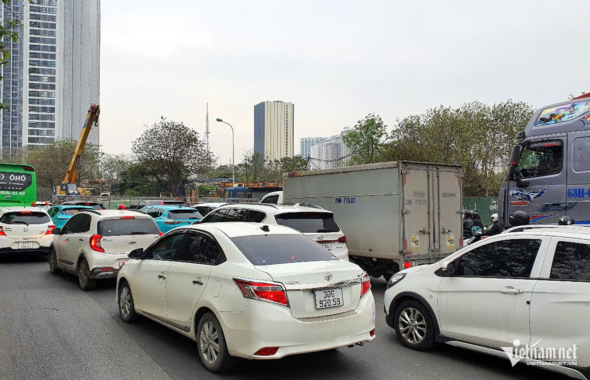 Theo ghi nhận của PV VietNamNet, trưa 19/3, Đại lộ Thăng Long (qua nút đi vào Trung Văn, quận Nam Từ Liêm, Hà Nội) lâm vào cảnh ùn tắc kéo dài.
