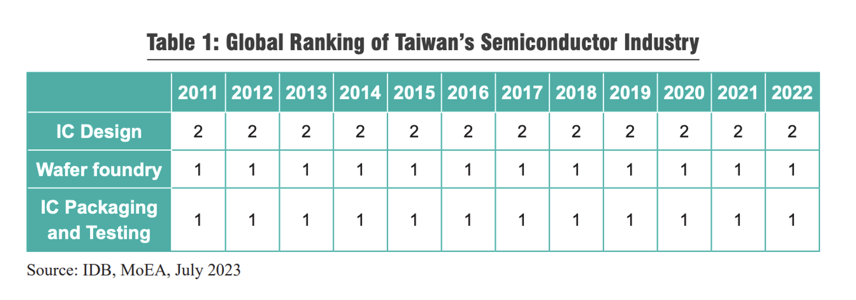 Trong suốt 13 năm qua, Đài Loan liên tục dẫn đầu hai trong số ba công đoạn chính của ngành bán dẫn và chỉ đứng sau Mỹ trong công đoạn thiết kế.