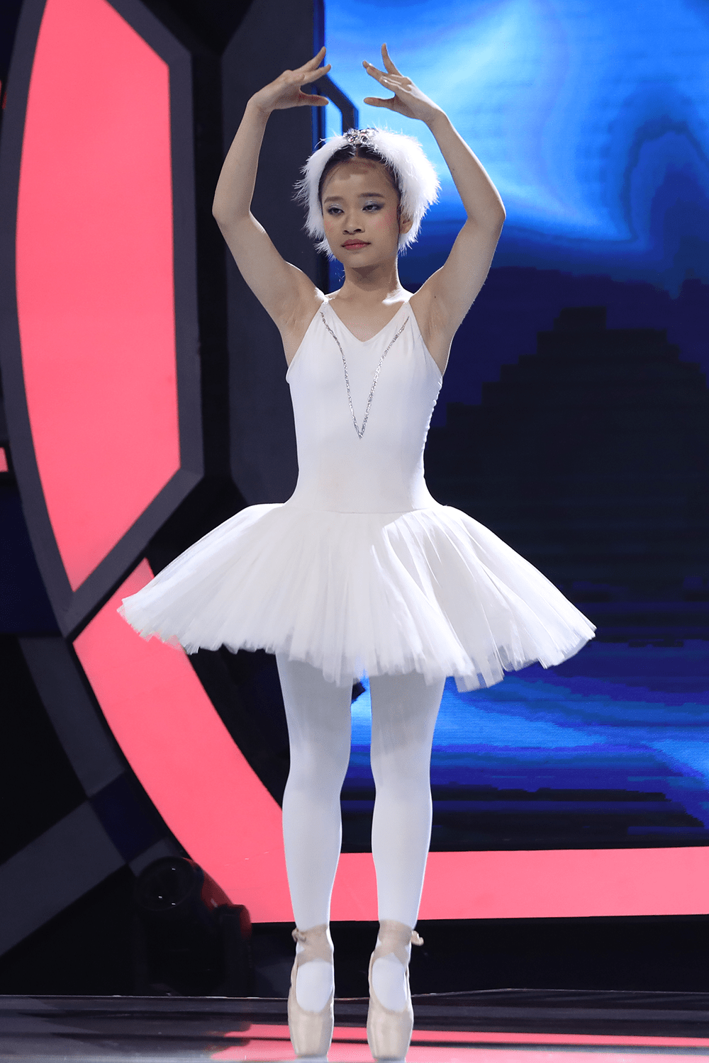 Để hoàn thành phần phi, Hà Linh phải dùng giày mũi cứng thực hiện kỹ thuật đứng thăng bằng và xoay trên mũi giày từ 1-2 vòng.