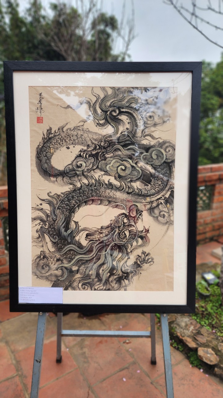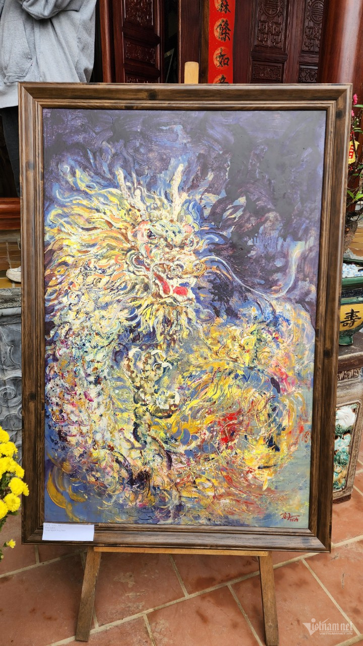 Bên cạnh đó, 2 bức tranh sơn dầu Chính long uy thế và Mãnh long trấn thủy của họa sĩ Nguyễn Trung Thành với nét đẹp kiêu hùng của rồng, là biểu tượng của sự cao quý, sức sống vĩnh hằng và sức mạnh vũ trụ cũng gây ấn tượng mạnh.