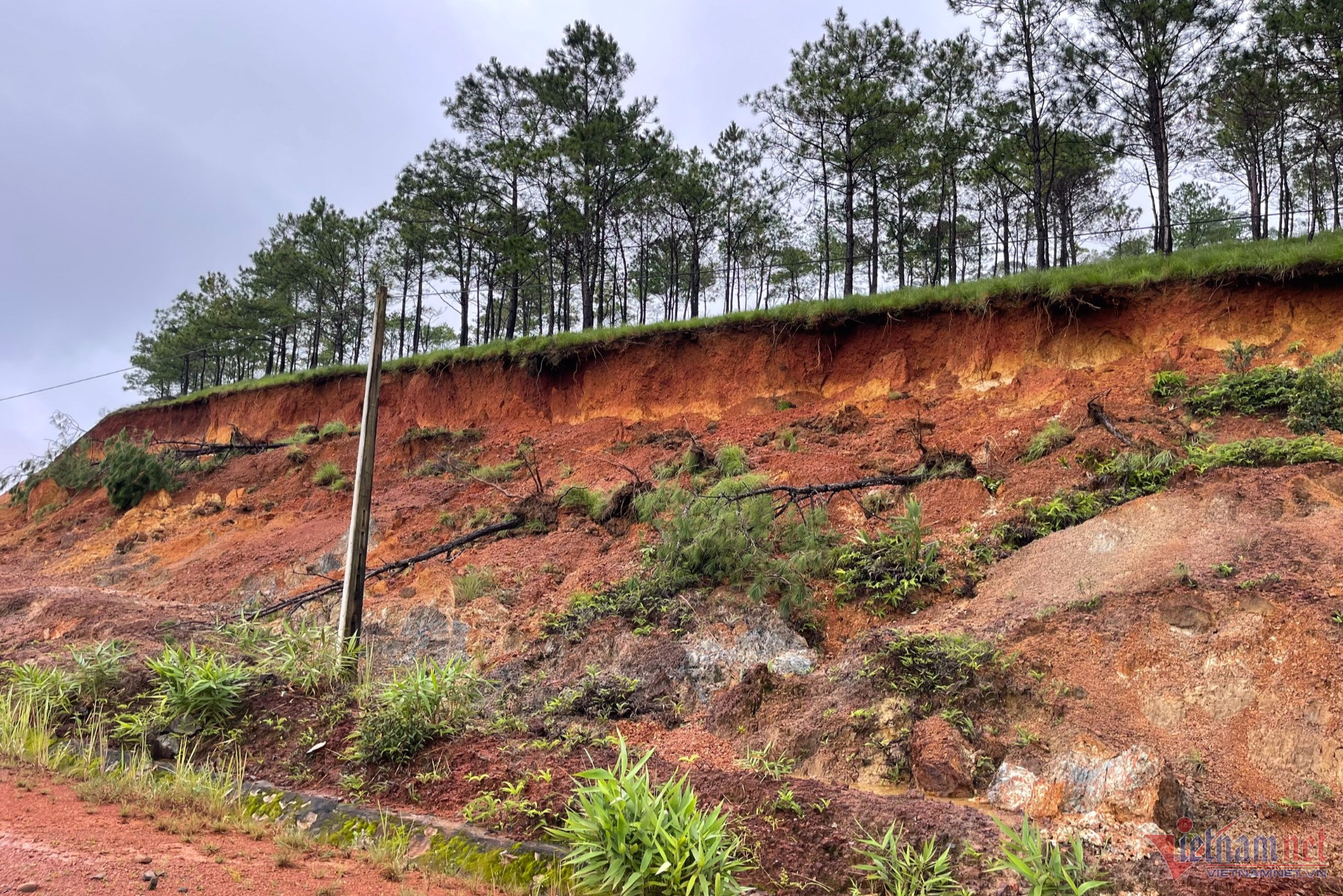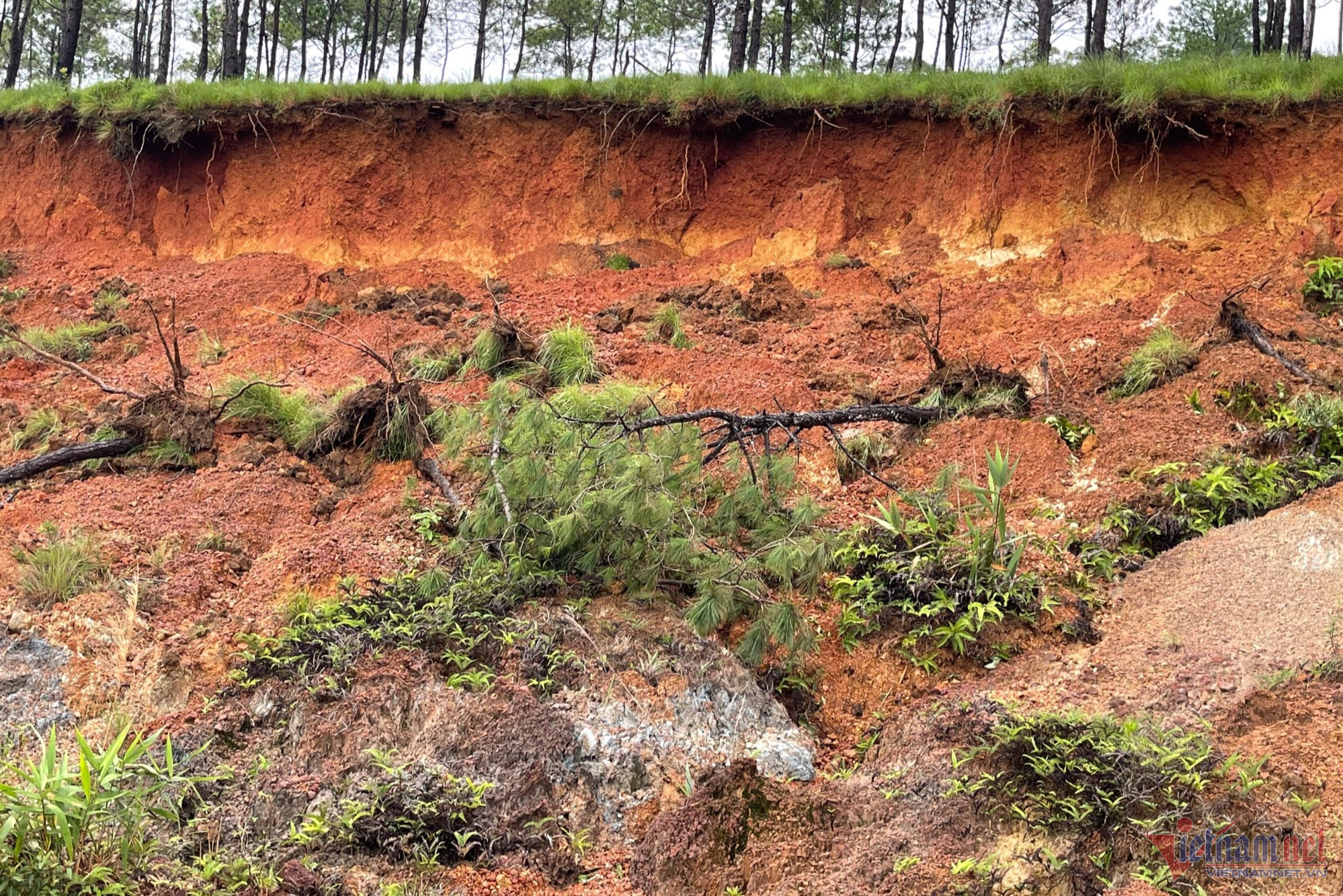 Ngoài ra còn nhiều cây thông trên đồi bị đổ rạp xuống theo đất đá. Những cây thông này đang bị héo lá. Điểm sạt sâu nhất ước từ 2-3m.