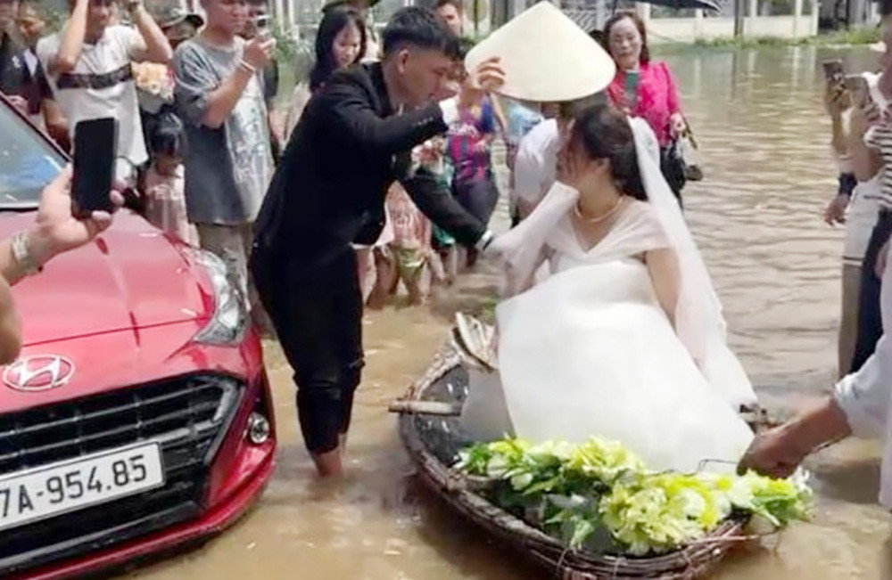 Người dẫn chương trình lễ cưới nói: “Một đám cưới độc và lạ, thời tiết mưa gió, nước sông dâng lên rất cao. Chú rể và những người bạn quyết định đưa cô dâu lên chiếc thuyền ba lá thật đẹp để chúc mừng cho hạnh phúc lứa đôi trong buổi trưa hạnh phúc ngày hôm nay”.