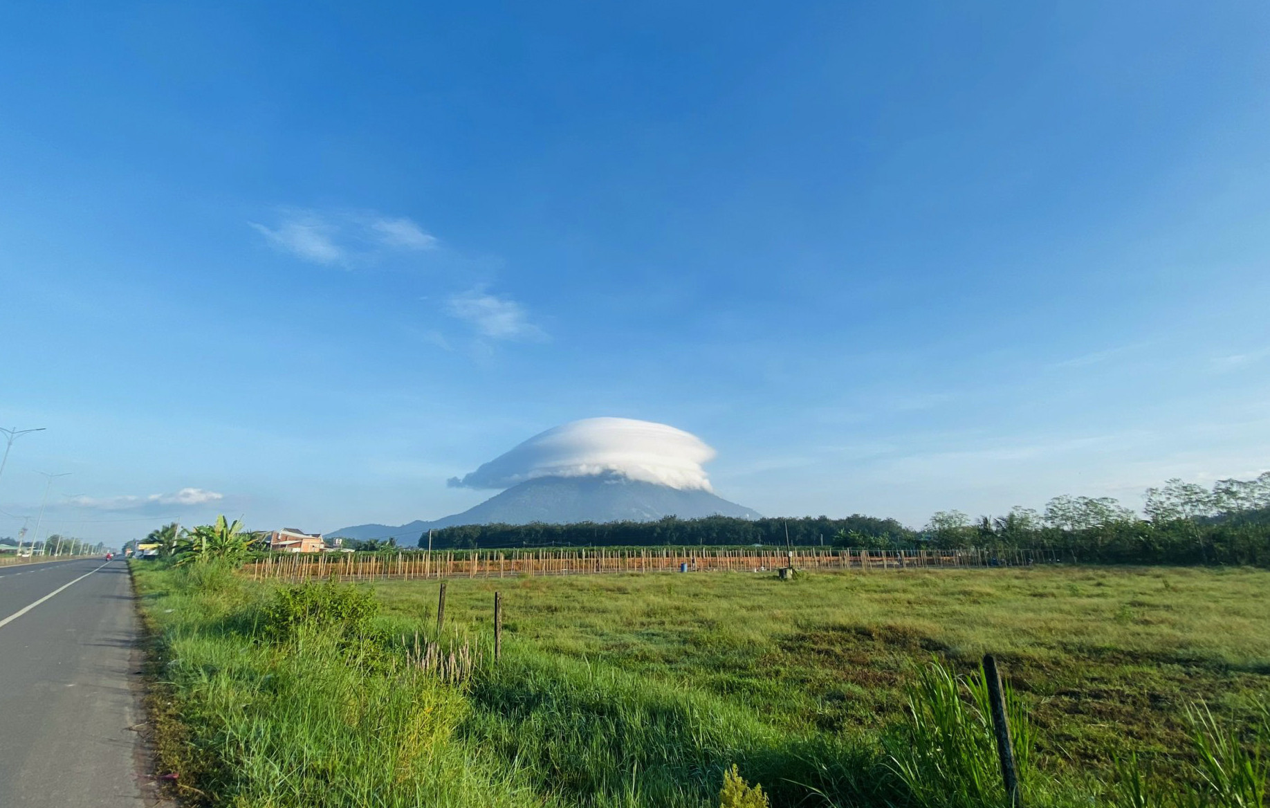 Theo đó, những đám mây lớn màu trắng xuất hiện bao quanh đỉnh núi, tạo hình thù độc đáo, khiến nhiều người chứng kiến liên tưởng đến đĩa bay hay chiếc nón khổng lồ. Không ít người còn cho rằng, đây là hiện tượng đặc biệt, có ý nghĩa tâm linh trên đỉnh núi thiêng Bà Đen.