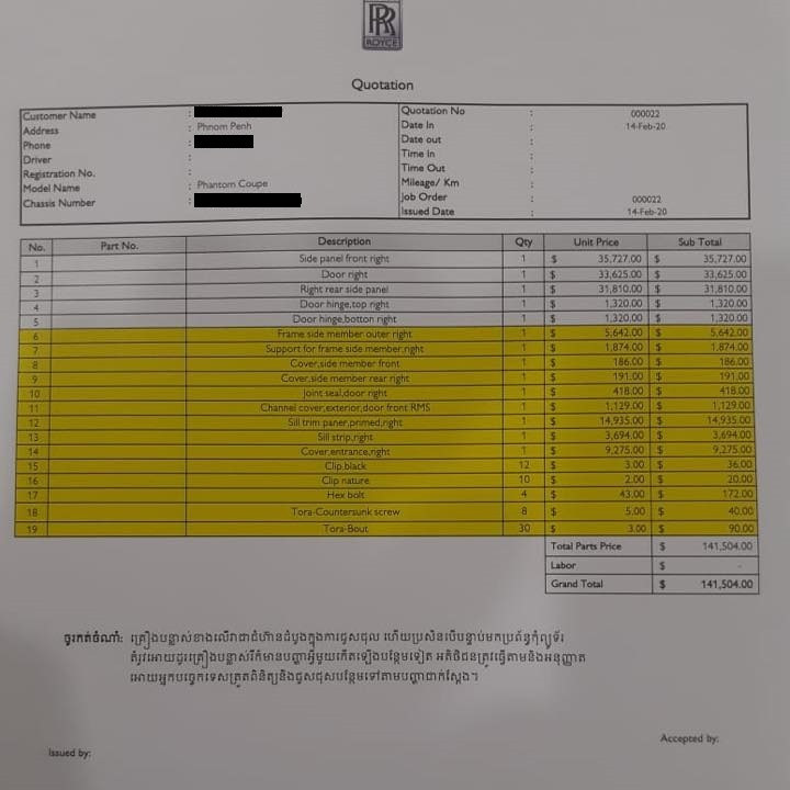 Tuy nhiên, đây chỉ là mức giá sơ bộ tại thị trường nước ngoài. Nếu sửa chữa chính hãng, có thể chủ xe phải tốn trên 1 tỷ đồng. Đơn cử như một chiếc Rolls-Royce Phantom Coupe của đại gia Campuchia bị móp cửa, hóa đơn sửa chữa chính hãng lên tới hơn 141.000 USD (tương đương hơn 3,48 tỷ VNĐ).