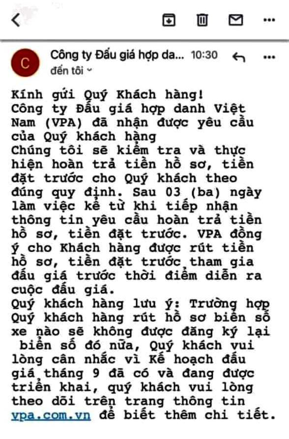 Tôi cũng đã gửi thư điện tử cho VPA và ngỏ ý muốn xin được đặt cọc lại để tham giá đấu giá lại 2 biển số từng rút cọc, nhưng không hề nhận được phản hồi", anh Toản kể.