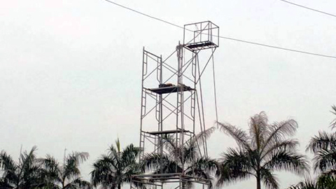 Tại hiện trường, dàn đèn kích thước lớn, nặng đè hư hại xe máy và một số thiết bị ở chân trụ đèn.